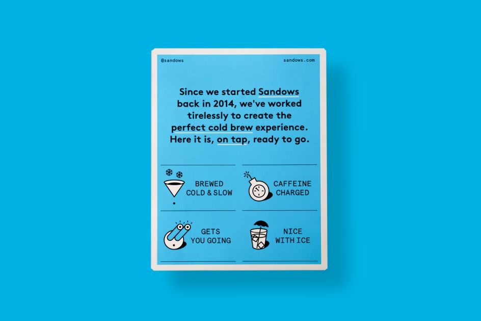 The new design includes packaging, point of sale marketing and a creative campaign. A new illustration style, together with an updated tone of voice – bold, immediate, fun and accessible – brings to life the characteristics of Sandows Cold Brew.