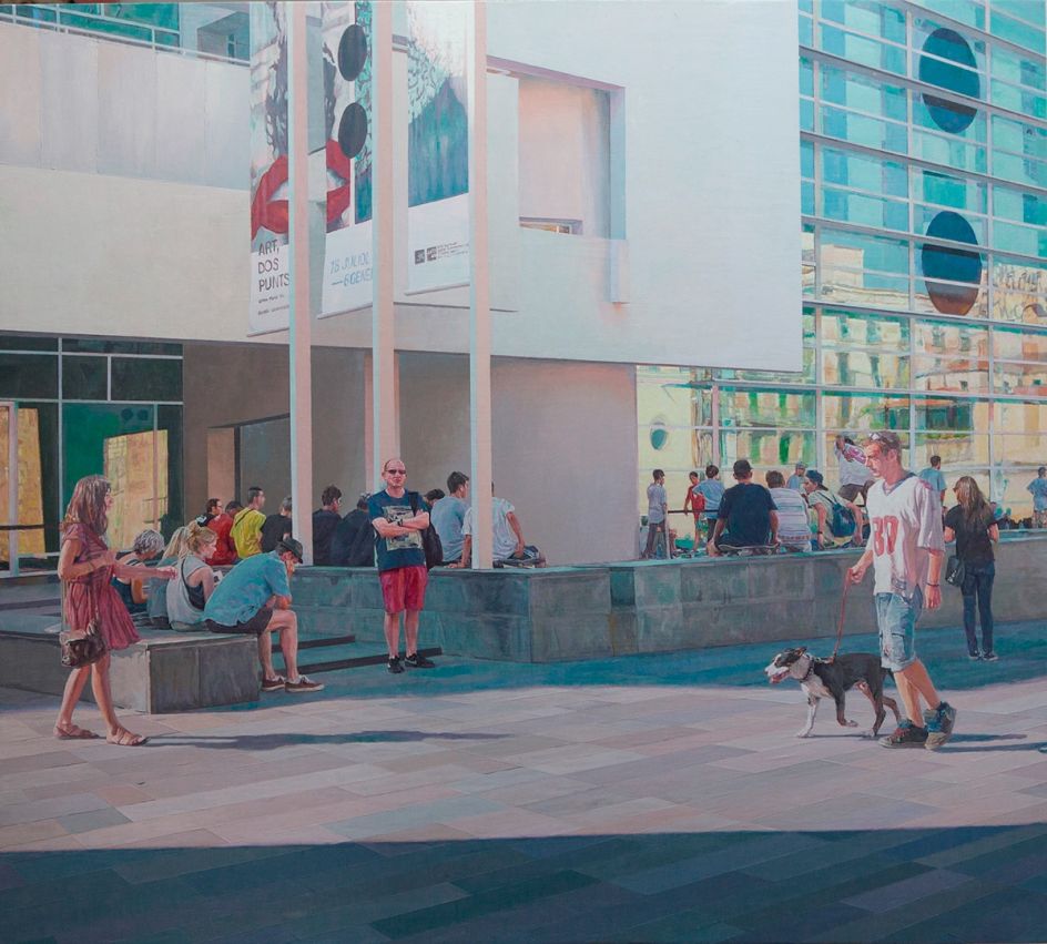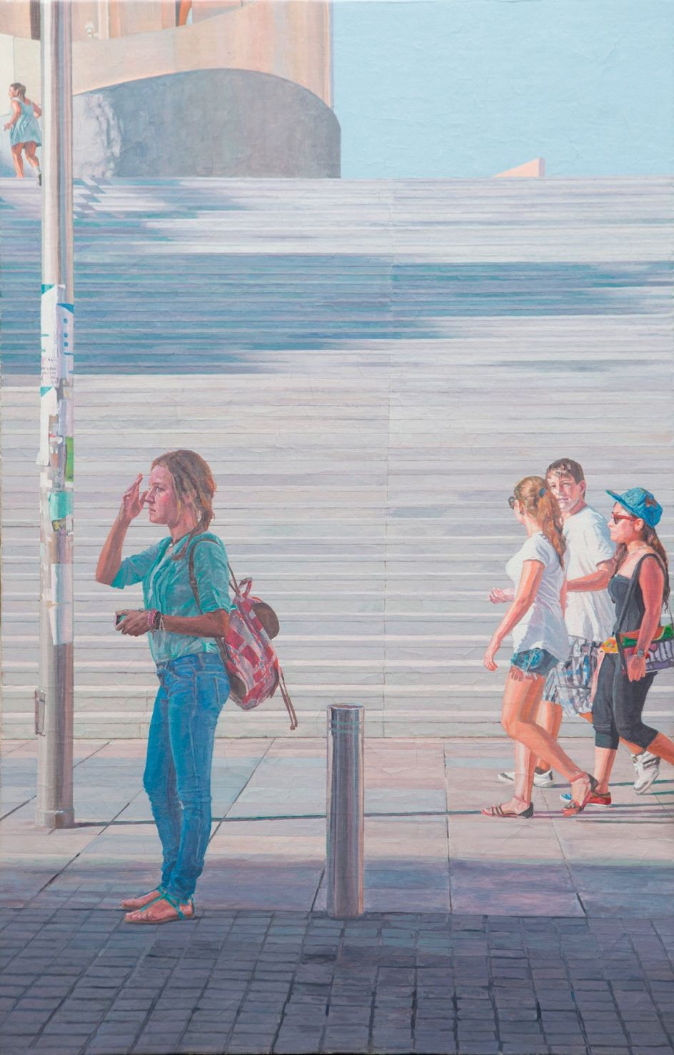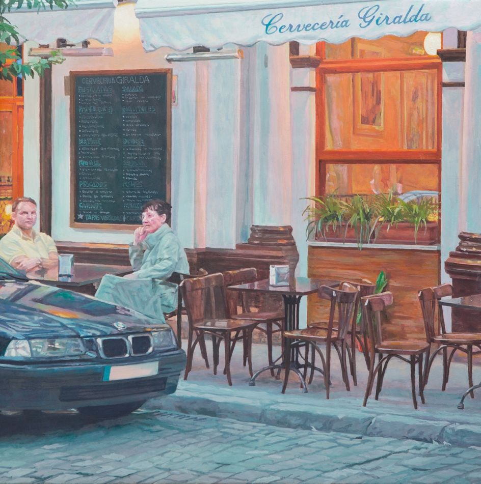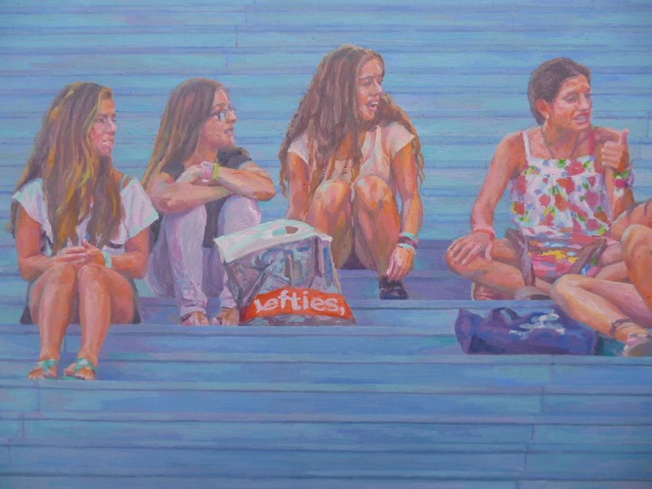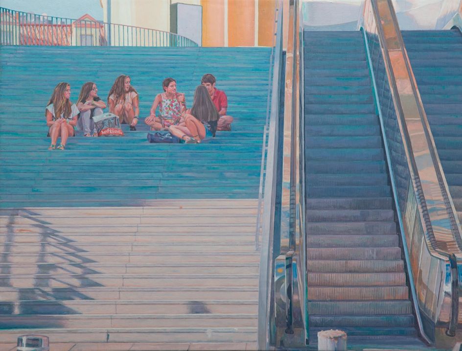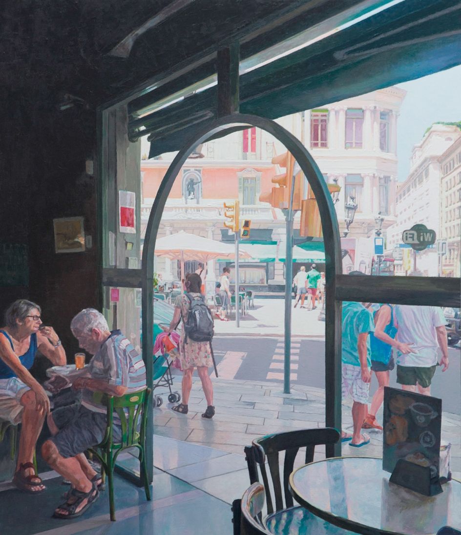 She celebrates the positive side of humanity, picking out what might be construed as ordinary but is actually quite special. Friends enjoying each other's company, sat on some steps outside a city library – laughing and joking. People happily wandering through the streets, window shopping. Older couples enjoying a late afternoon drink outside a bar, watching the world go by. Every painting gives us that immediate holiday feeling.