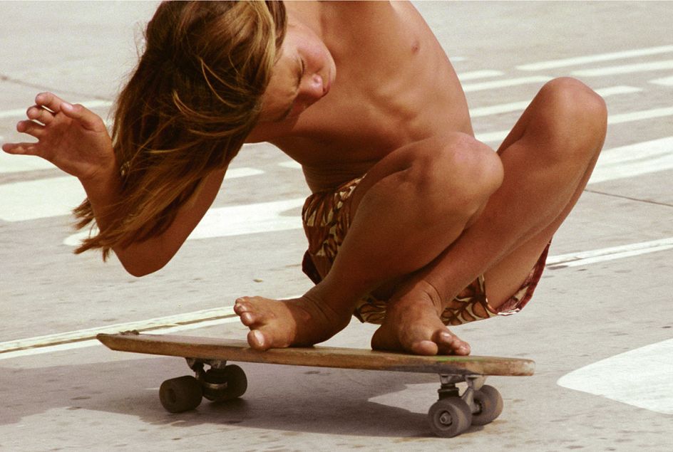 Then one afternoon in 1975, while driving up Laurel Canyon Boulevard, Holland encountered his first skateboarders carving up the drainage ditches along the side of the canyon, and Holland knew he had found his subject. Although not a skateboarder himself, Holland never tired of capturing on film the beauty and grace of the burgeoning craze for the next three years. By 1978, the scene had become more commercial, and Holland’s documentation of the skateboarders came to its natural end.