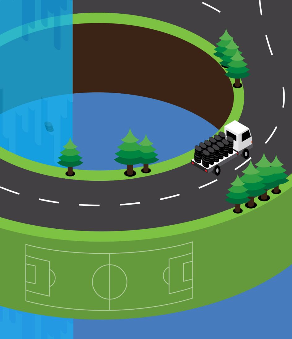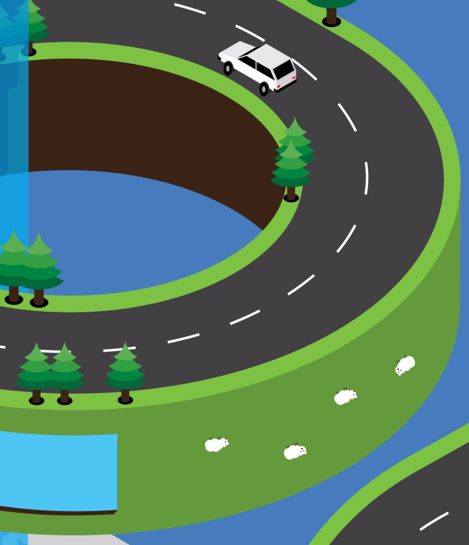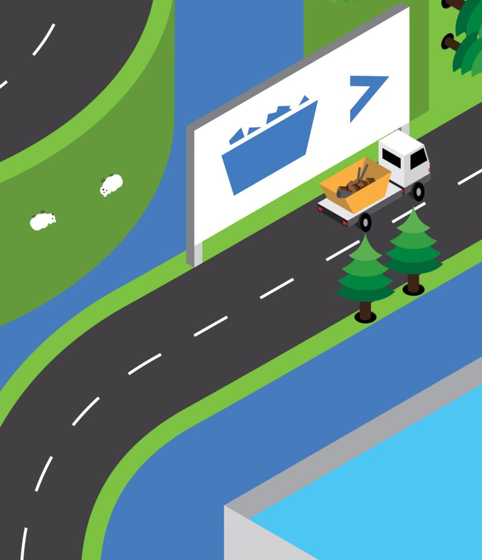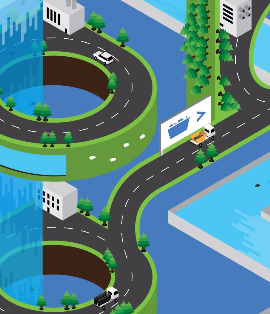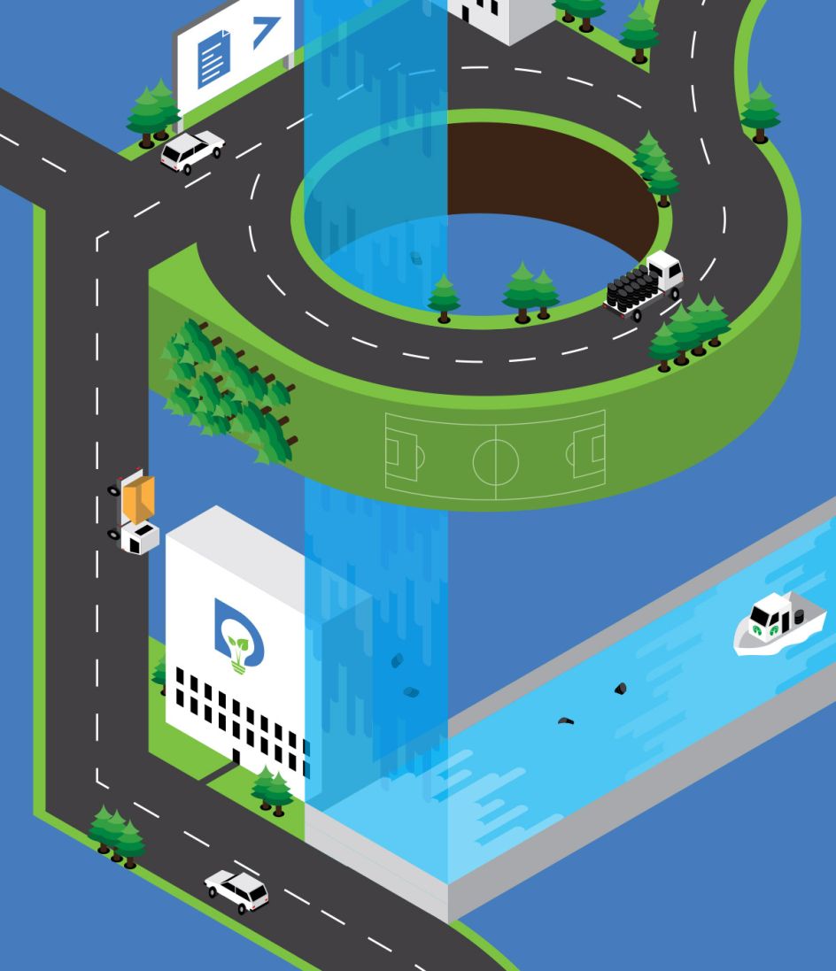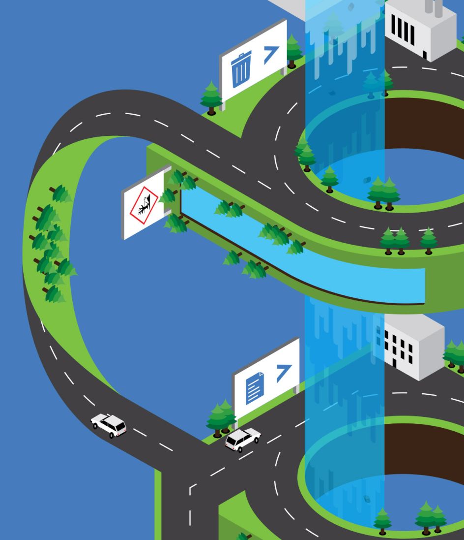 "Since they would be guiding users through this confusing world and waste is transported via vehicles, it made sense that the paths should actually be roads. This would help to add an element of reality since the client also requested that the illustration should not become too fantastical in style."