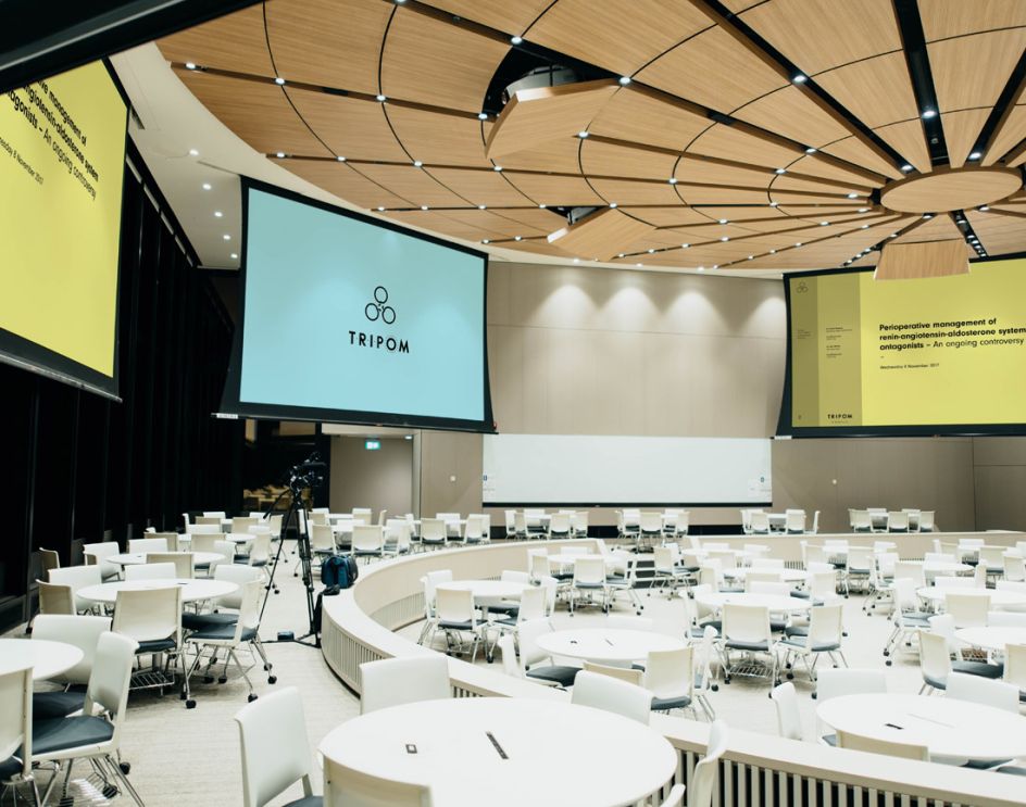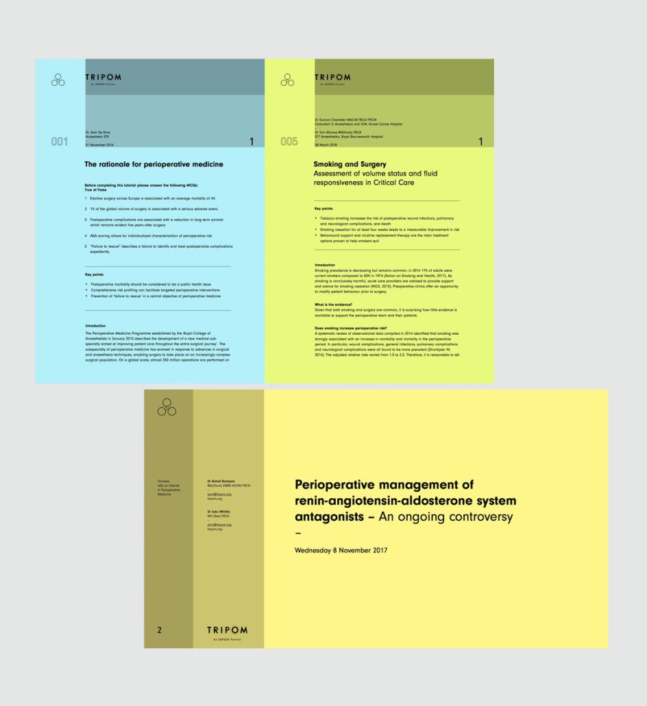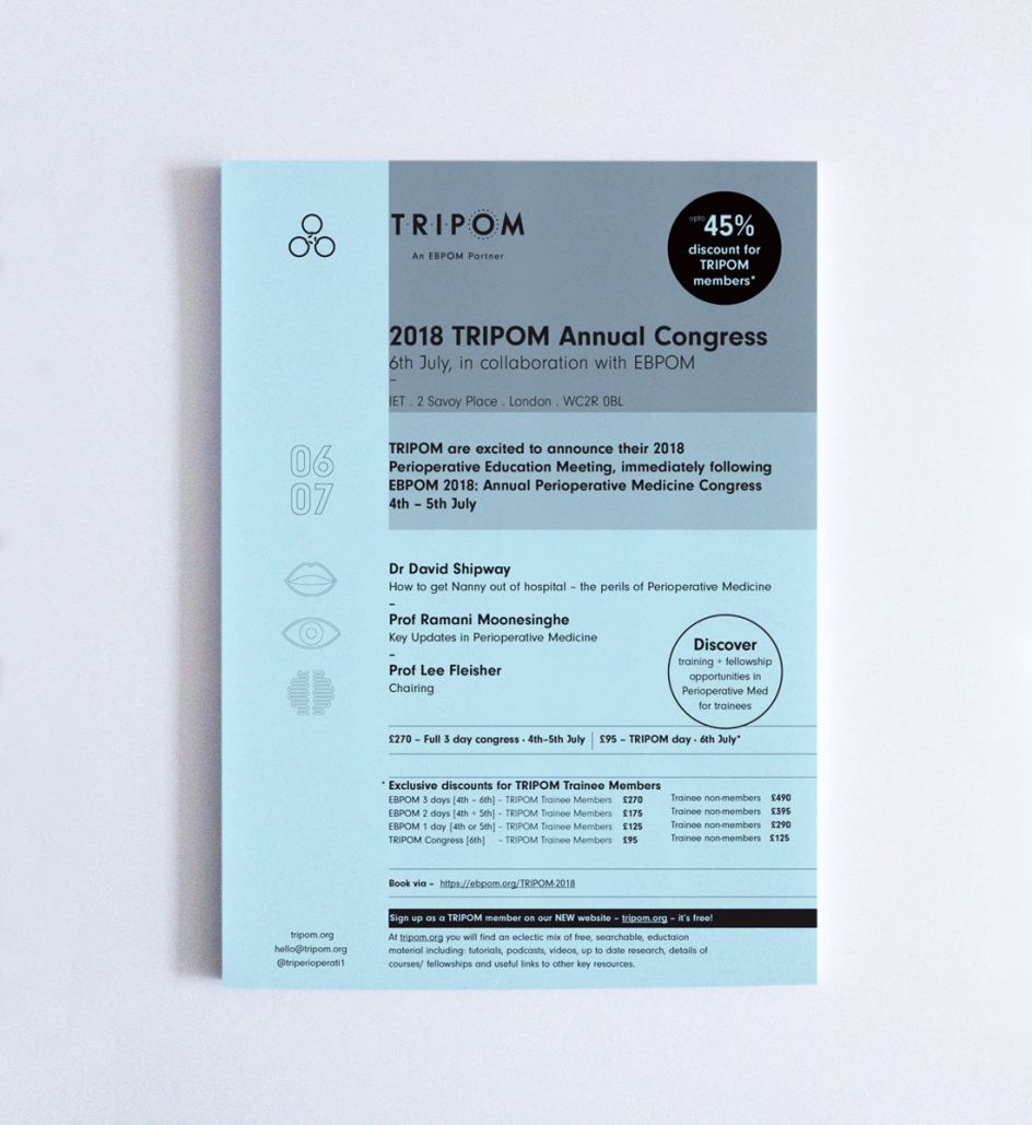 Called TRIPOM (Trainees with an Interest in PeriOperative Medicine) their existing DIY identity played on the pun TRI (three) + POM (Apple in French). "This was a great idea and established standout from medical cliches," says Mark Richardson of Superfried. "Numerous arrangements and styles were explored, but a triangular/rotational form was selected – having an apt chemical/medical diagrammatic feel."