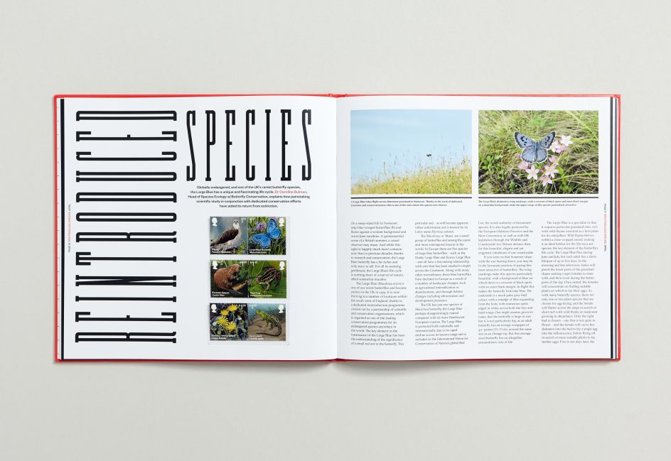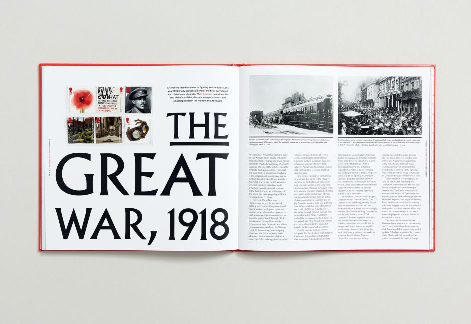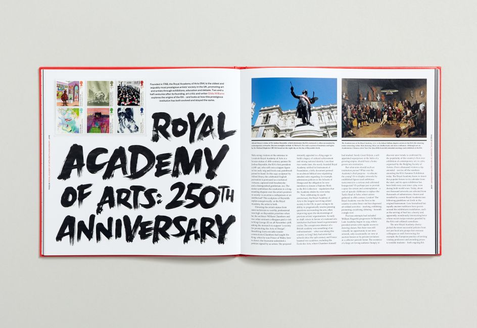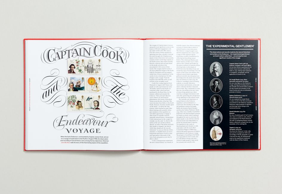 The cover and presentation box features a different treatment of the book title on each face – reflecting the diversity of the stamp subjects within. Printed with a warm red Pantone ink as a nod to the iconic Royal Mail post box, the book has a magazine-like feel to the flexible grid allowing for short and long chapters depending on the depth of the subject matter.