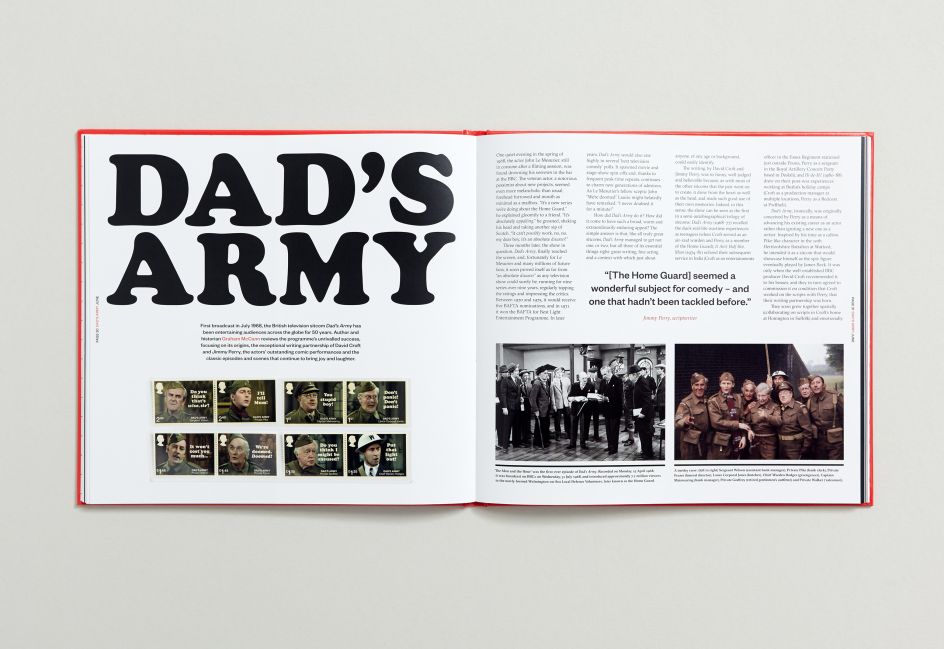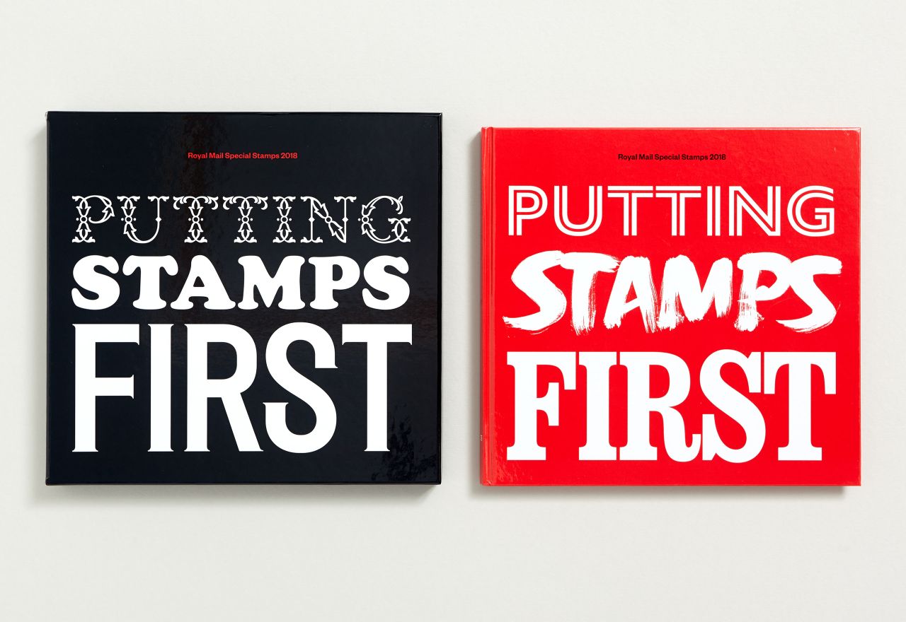 Appropriate typefaces were chosen to reflect the subject matter's era or styling and were mostly created in-house, as well as commissioned lettering by calligrapher John Stevens and letterpress workshop The Letterpress Collective. A predominantly black and white approach was chosen for the typography that sits around each stamp, to allow the stamps themselves to leap off the page and become the focus of the design.