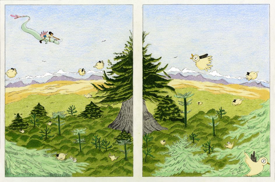 "The one place I did use words was in chapter titles to explain the locations where the girl and dragon were headed. I felt like that was something I couldn't leave unsaid, and it did help give the story more structure. I also used colour to explain the mood of certain parts of the story, to help guide the reader."