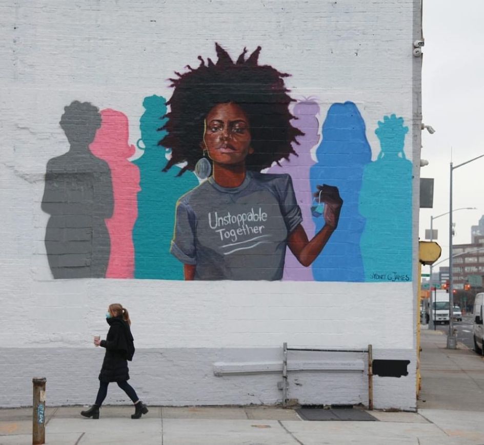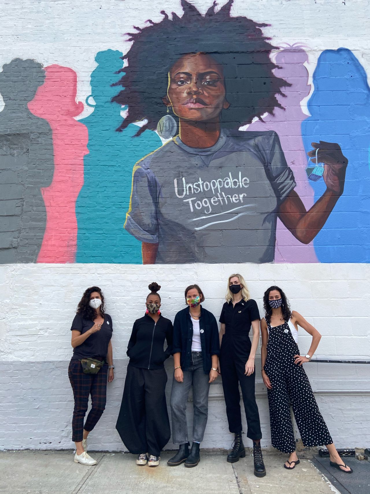 "My inspiration for the Unstoppable Together mural was the women in my life," the artist says. "From my mother, the Matriarch to my friends or muses, I am inspired and motivated daily. I am surviving and working through this pandemic because of them. The collective of 'us' combined has made me 'unstoppable'. And the motivation and inspiration is a two-way swinging door. We take care of each other."