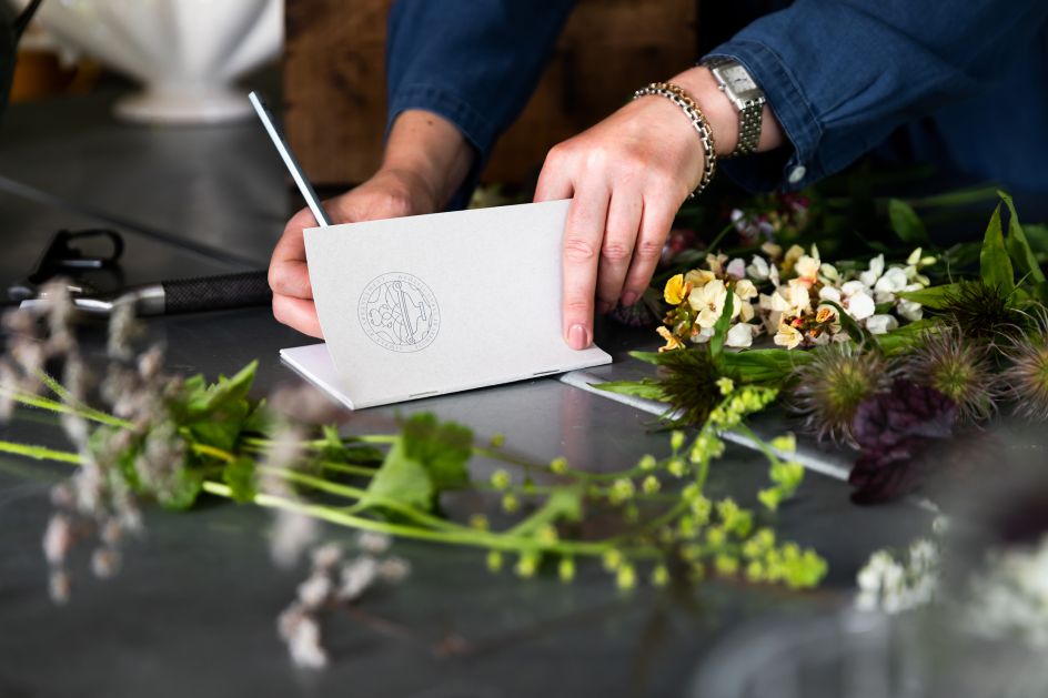 "This is echoed in the illustrated main logo which represents an abundance of vine leaves and tendrils. Sarah sources and collects vessels to complement the flowers and her most treasured one is featured in the logo to add a personal touch. A second logo features Sarah’s favourite flowering fritillary a soft and gentle delicate flower reflecting her sympathetic understanding and empathy with nature."