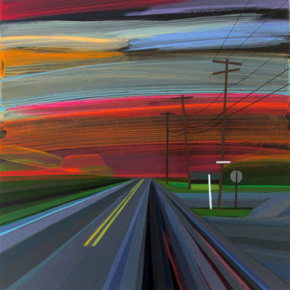 His images are inspired by and reflect the country roads, flat landscapes and surrounding water that he takes in as he travels the area in his pickup truck. His signature motif of utility poles with power lines creates an original sense of movement and depth to his distinctive compositions.