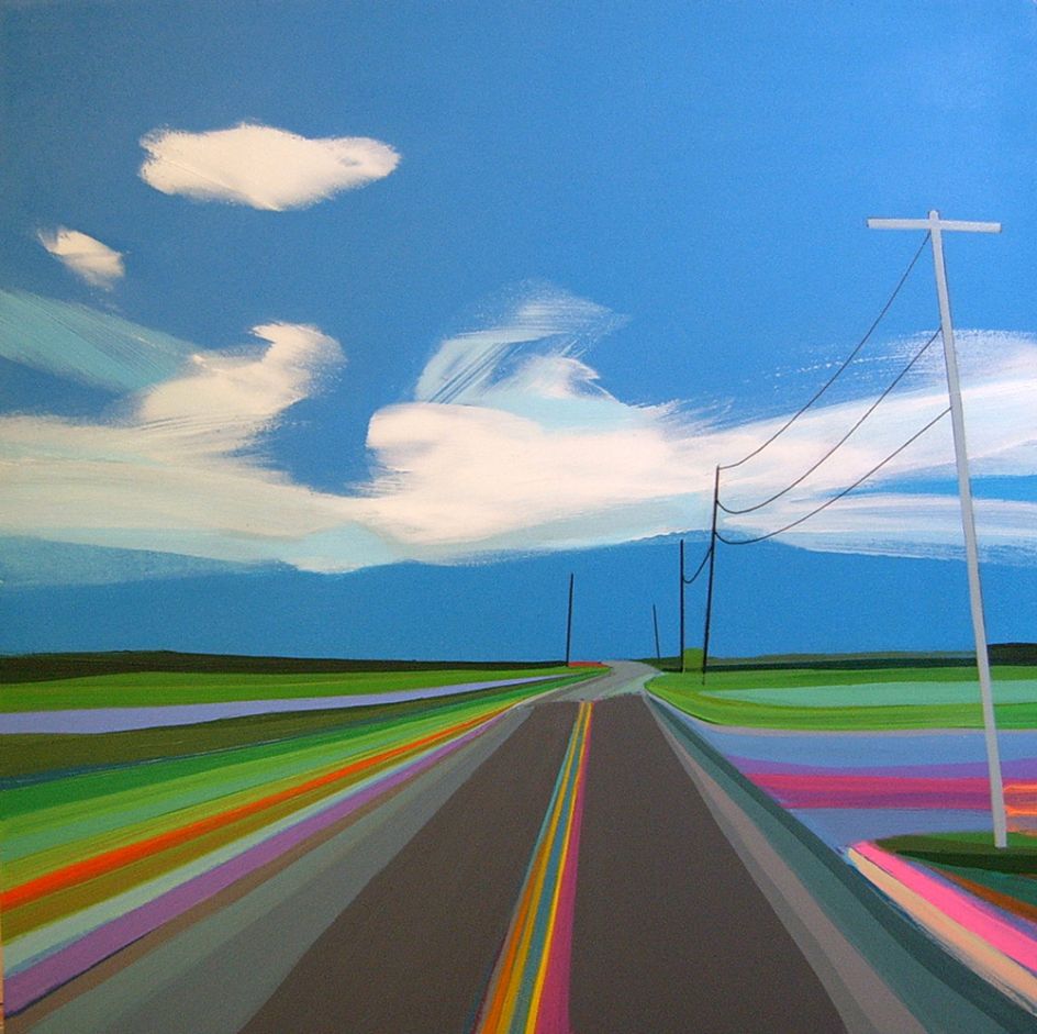 His bio on his website reads: "Haffner's moody acrylic paintings reflect his adoration for the area. His compositions are rendered with a bold and sometimes neon colour palette, which is cleverly balanced to depict the speed and rhythm of the rural roadways. The slightly exaggerated poles and power-lines are primary to these compositions as they are utilised to create the depth of field and perspective. Haffner is committed to exploring these horizons, which appear to extend as far as the eye can see, with no end or beginning.