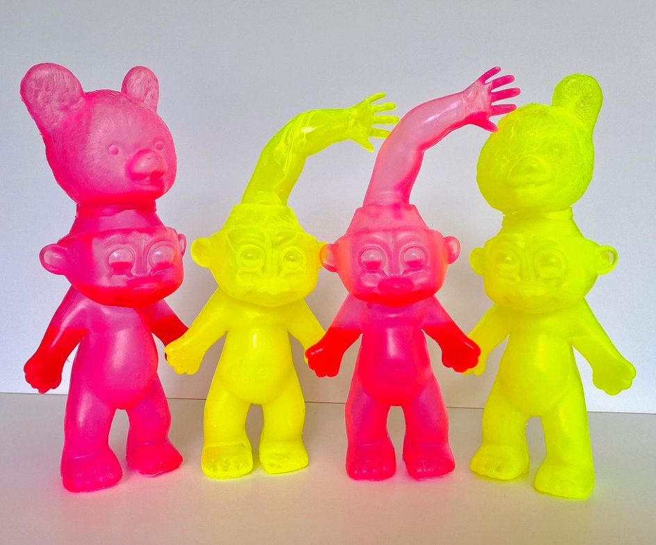 As for their sculptures, old, discarded toys are reclaimed and used to create new 'toys' which merge childhood memories and recognisable objects in an unsettling way. And even though these toys are "visually playful, having an overall bright, balloon-like, happy appearance", there's no denying that they fall within the disturbing realm of the uncanny valley.