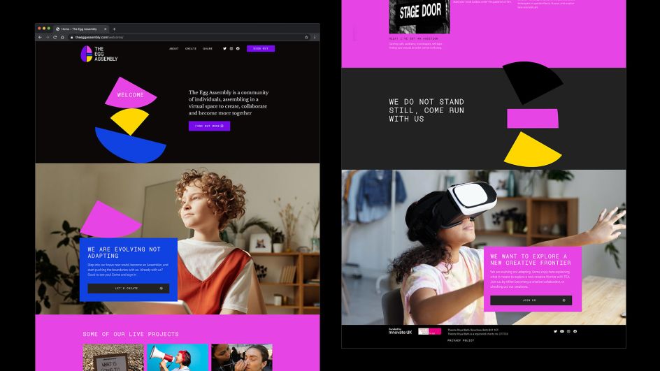 "The Egg offers free training sessions to local children from 5-18 years old, pre-Covid these sessions were face to face activities, but the current situation has meant they've had to adapt," says Jamie Ellul, creative director at Supple. "So we were briefed to create a look and feel for their new offer The Egg Assembly – aimed at encouraging young artists and performers to engage with the online learning platform."