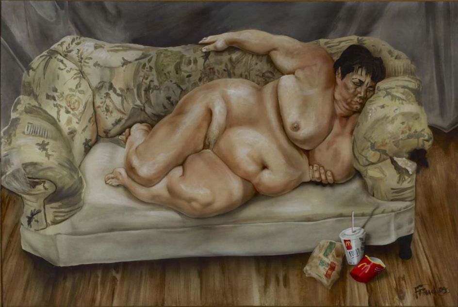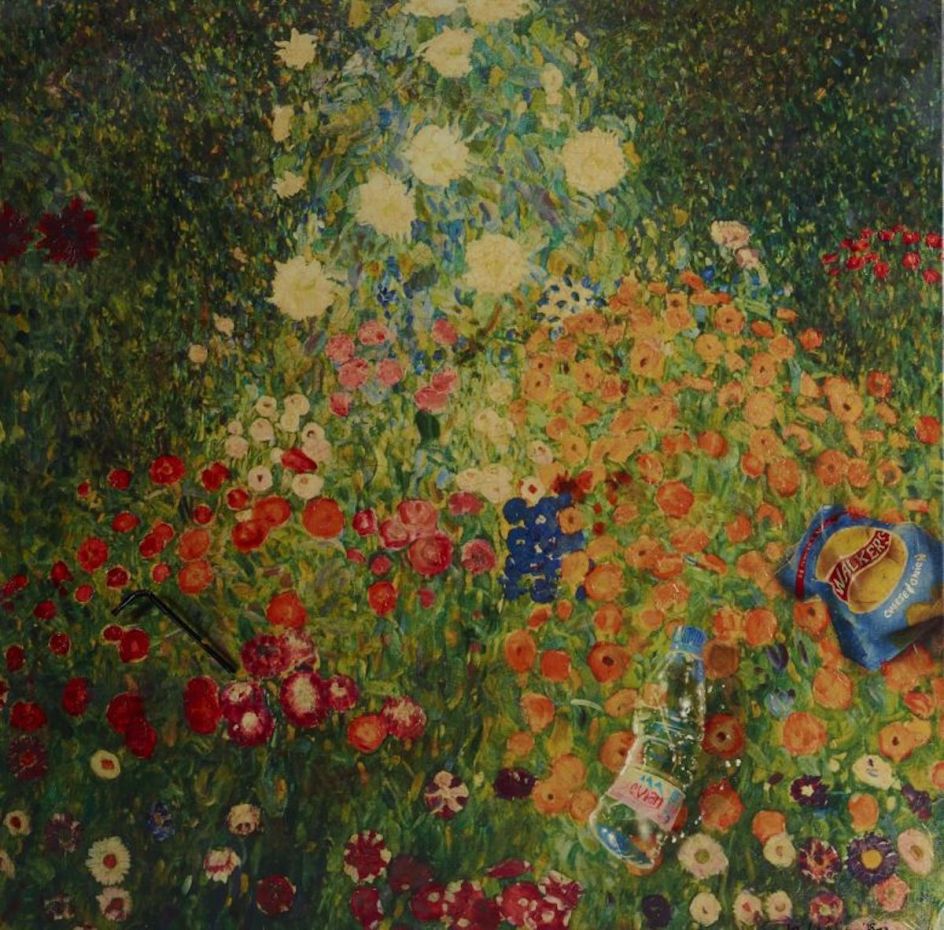 An empty Evian bottle bobs alongside Monet’s water lilies, Van Gogh’s starry night is strewn with Sainsbury’s bags, and Lucian Freud’s fat lady sleeps beside empty Mcdonalds wrappers.