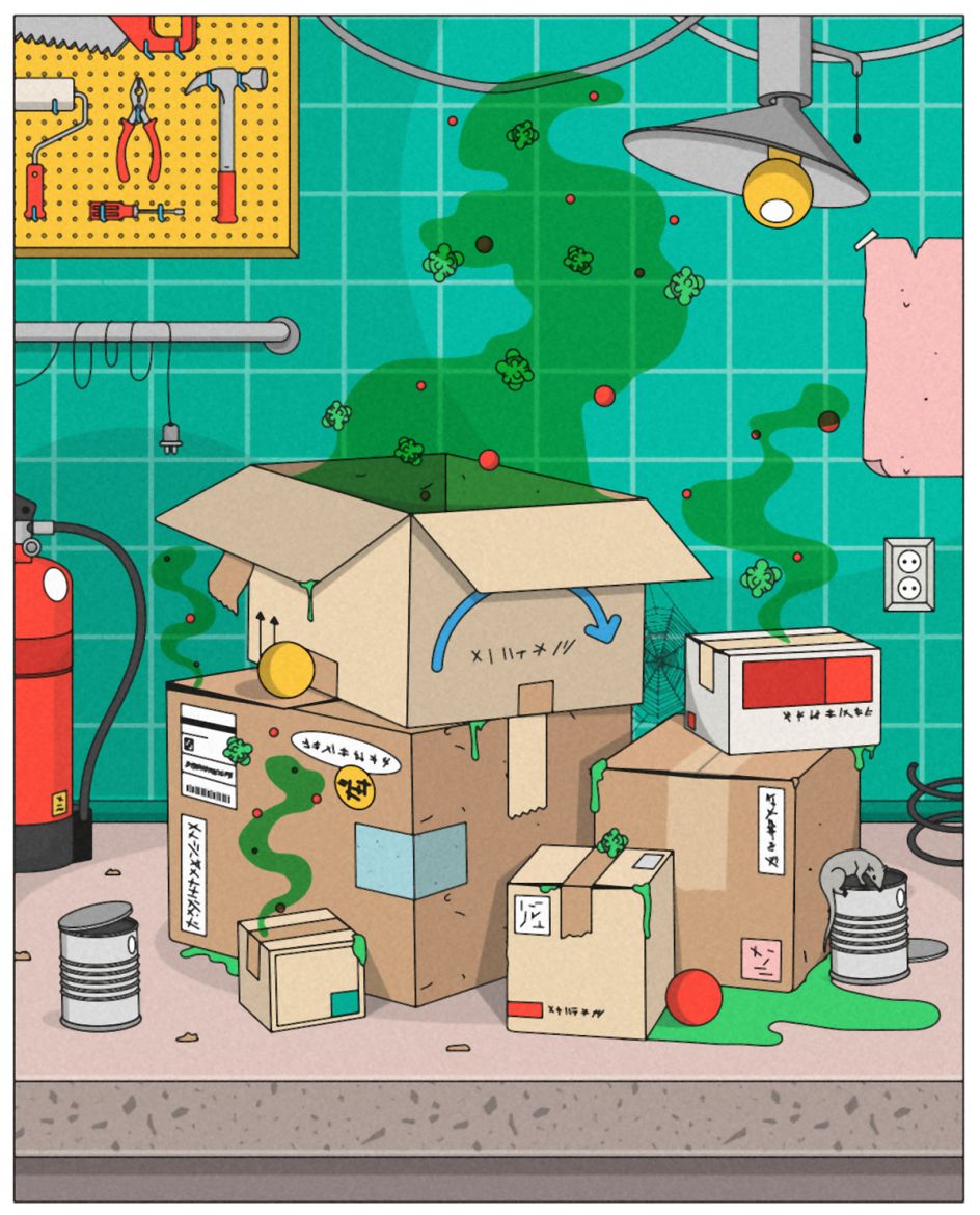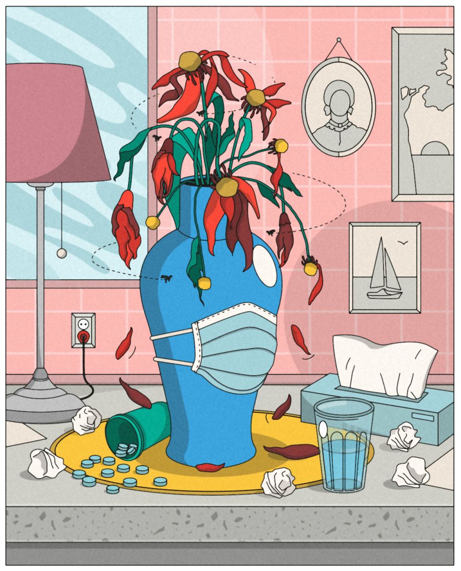 "I wanted these rooms to feel compressed and packed, full of objects to give the idea that they are trying to suffocate us. And to be honest, all this time confined at home and spending a lot of hours in the same space sometimes ends up being a bit chaotic."