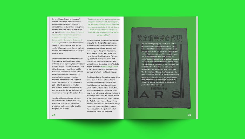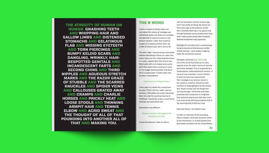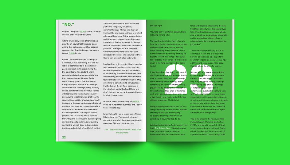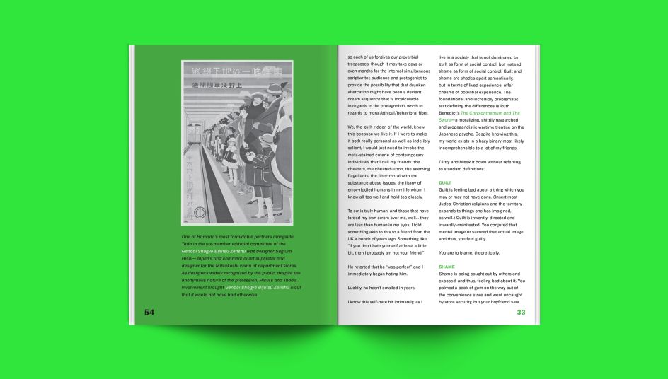 The pages are peppered with some gorgeous imagery with a striking lime green and black colour palette. Offset printed and screen-printed, the book is typeset in the Biwa and Biwa Stencil families of digital typefaces from Wordshape. Oh yeah, and it glows in the dark.