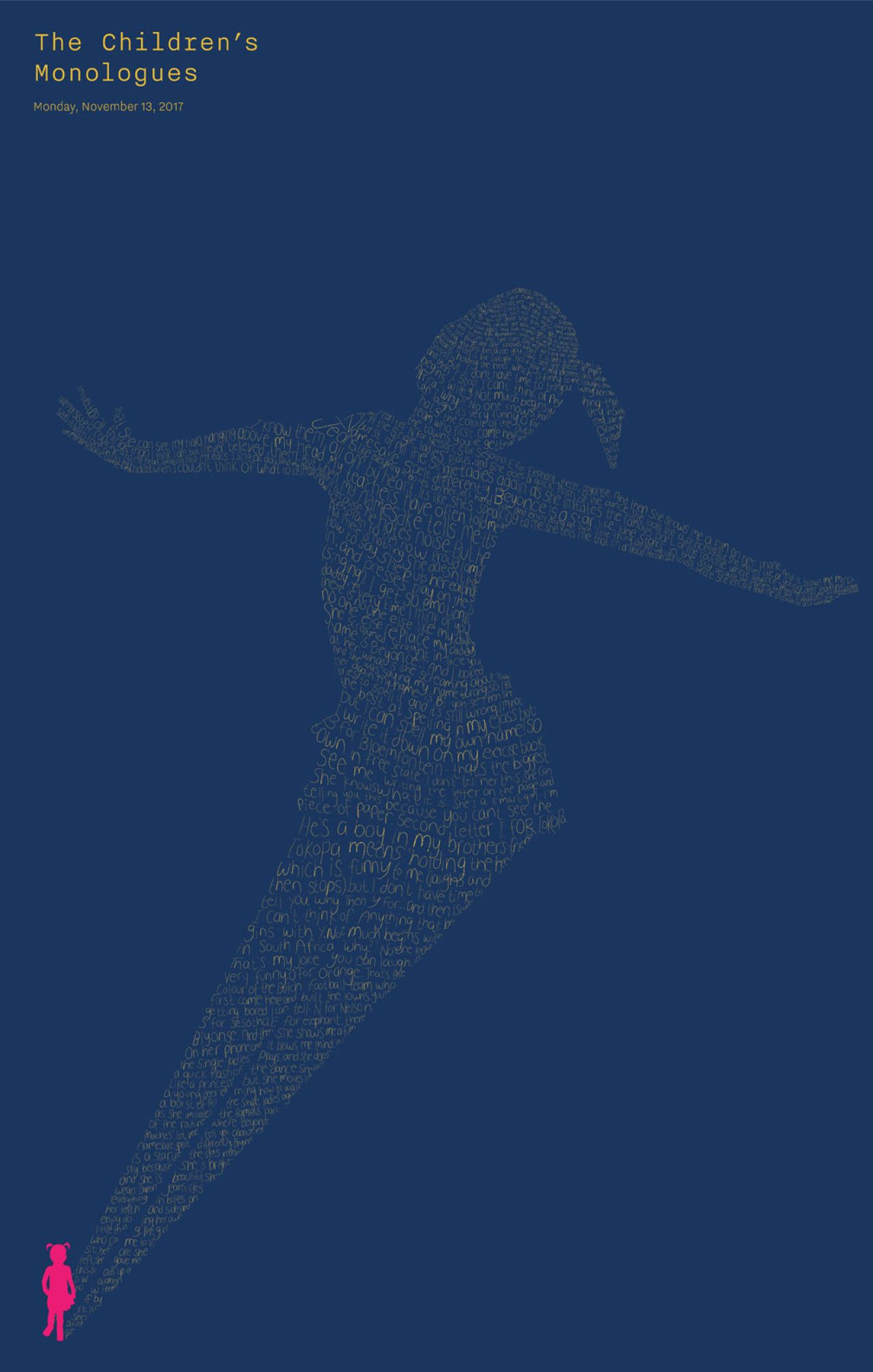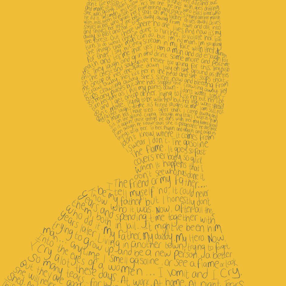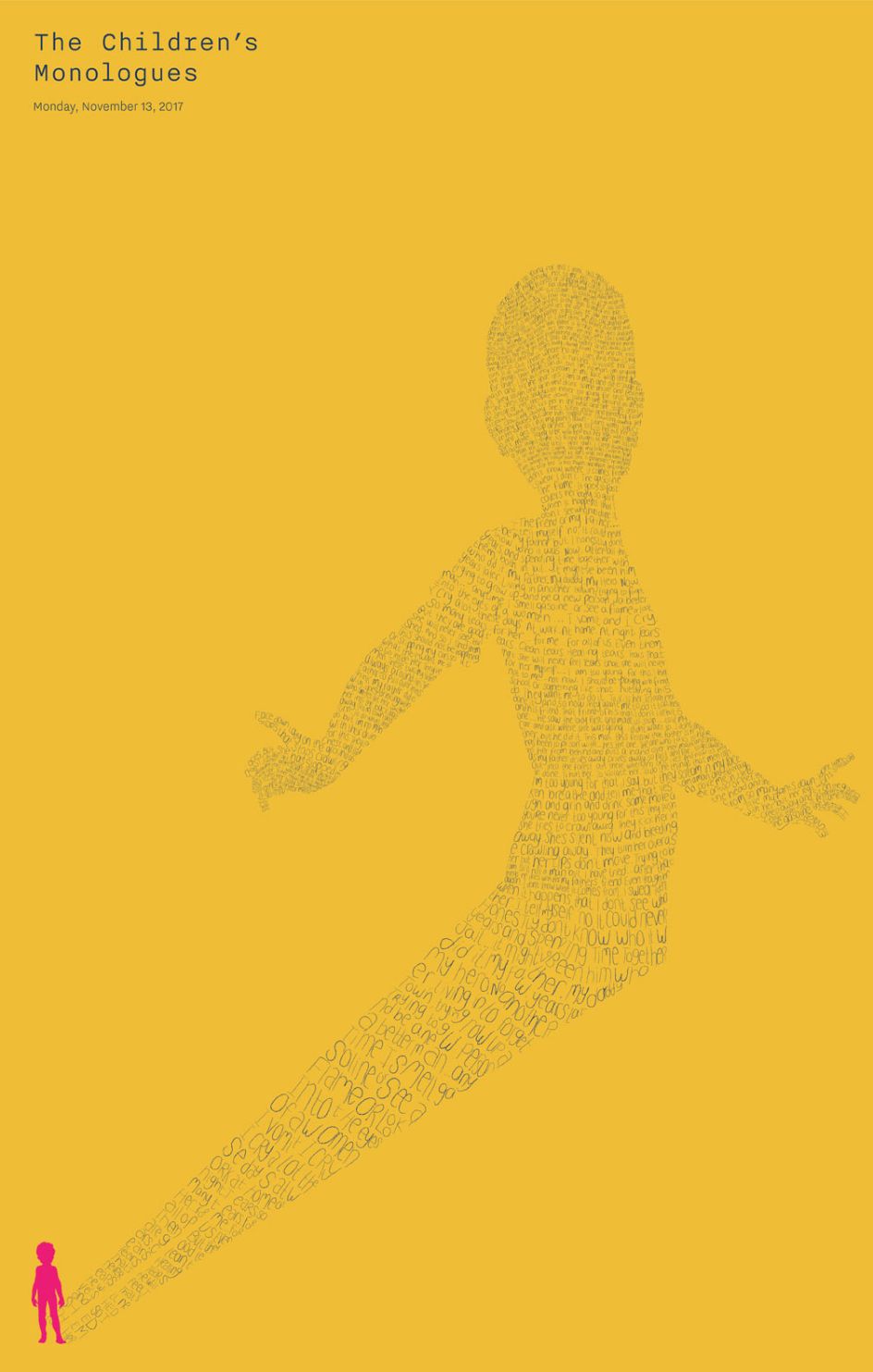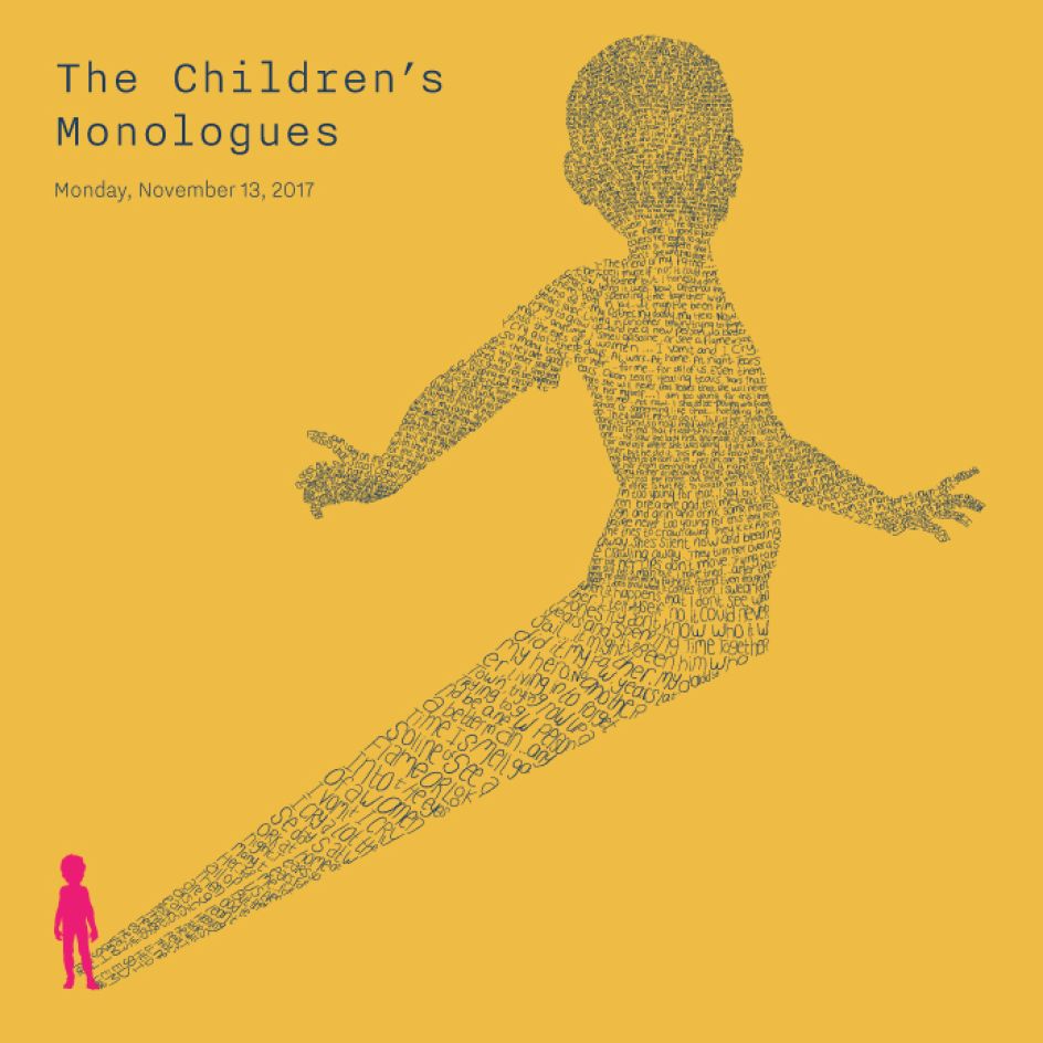 In designing posters, event graphics, programmes and other printed materials, The Partners created hand-drawn typographic illustrations from the complete text of each monologue, "referencing the dramatic telling of the stories on stage, and how the event rings a unique focus and emotional power to children who would otherwise have no voice," the agency explains.