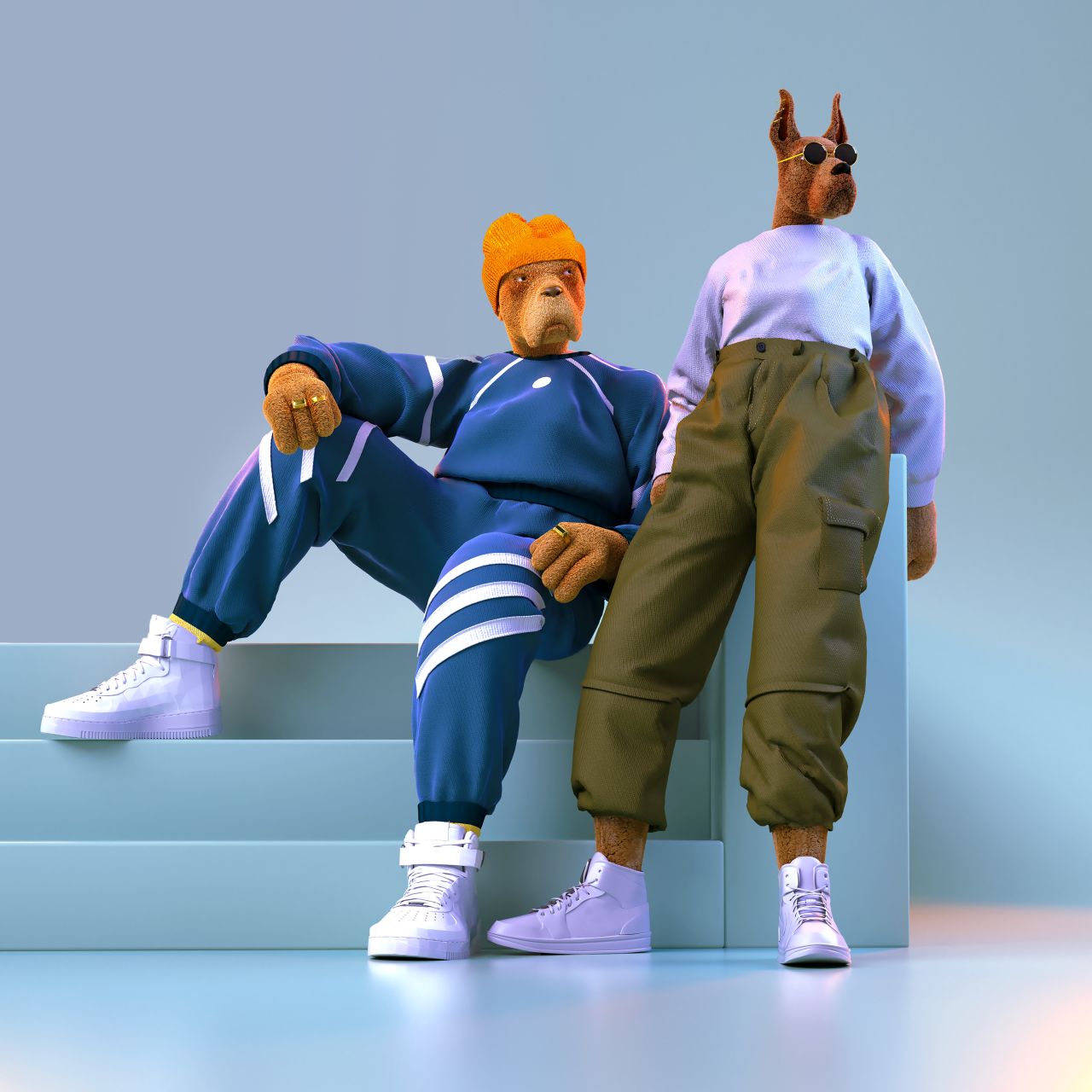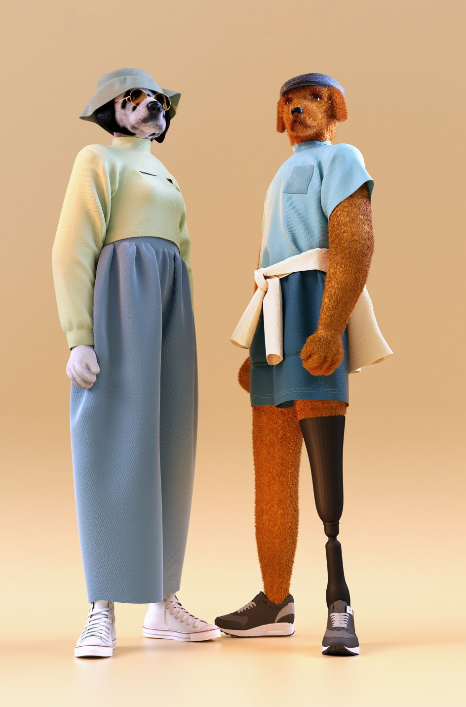 "As the realistic dogs take a human-like form we need to soften and adapt some features such as their hands, body shapes and faces. We imagine that if dogs were to take on human characteristics they would be cool and street, taking up space and being self-assured in their role."