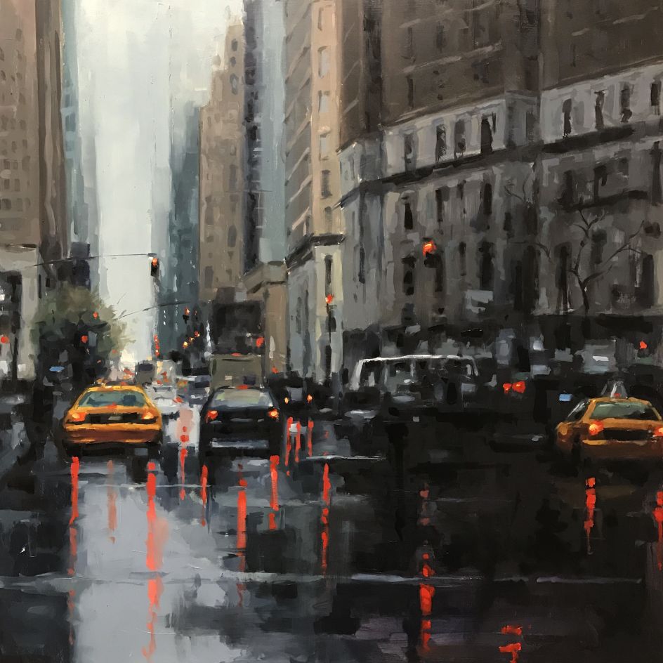 Dickinson describes his style as an "impressionistic form of photorealism, capturing elements of photography/cinematography such as depth of field and filtered lighting, with a loose, painterly approach associated with painting directly from life".