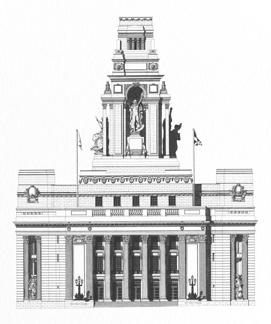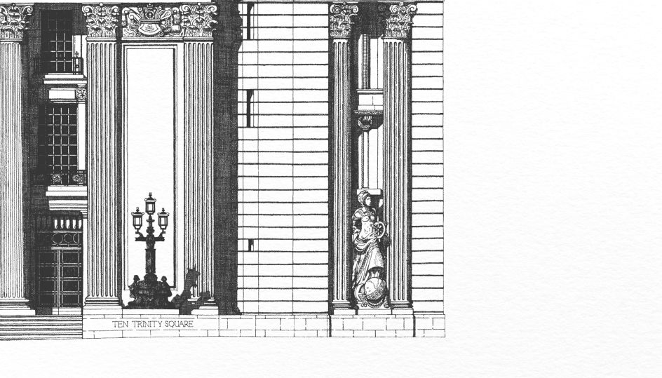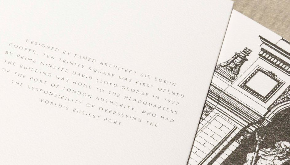 The agency was briefed to create an identity that echoed the building’s history as the former home of the Port of London Authority at Trinity Square. As such, much of the look and feel references the "beautiful lines" of the hotel’s architecture, as well as local historical characters like Samuel Pepys and Geoffrey Chaucer. Herem was commissioned to create his large-scale drawing of the front of the building when The Plant realised the similarities between his style and and the detailed imagery exhibited in archived drawings by architect Sir Edwin Cooper, which it used as research.