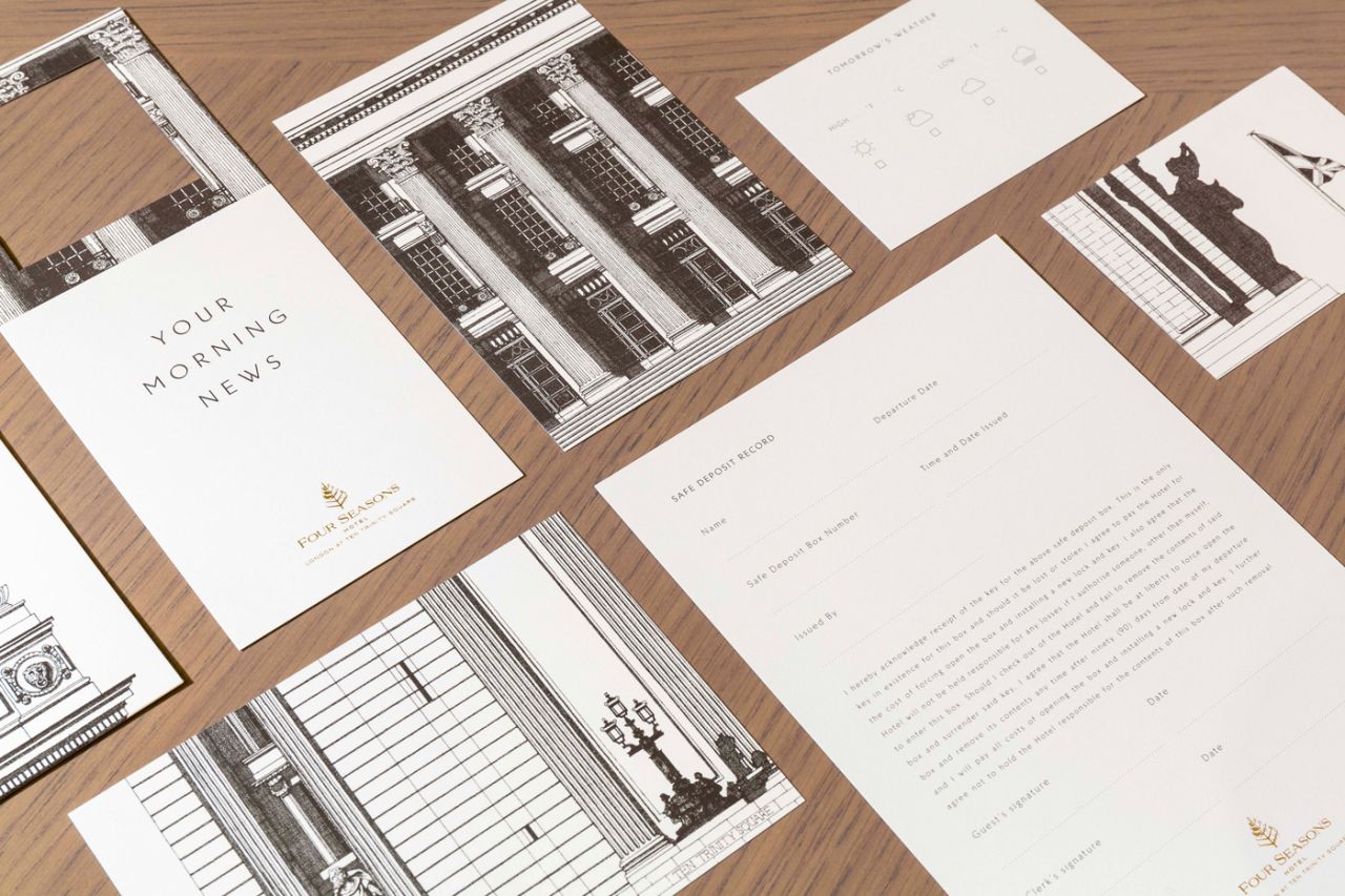 London agency The Plant has created new branding for swanky London hotel The Four Seasons, using a stunningly detailed (and accurate) drawing by Thibaud Herem across many of its applications.