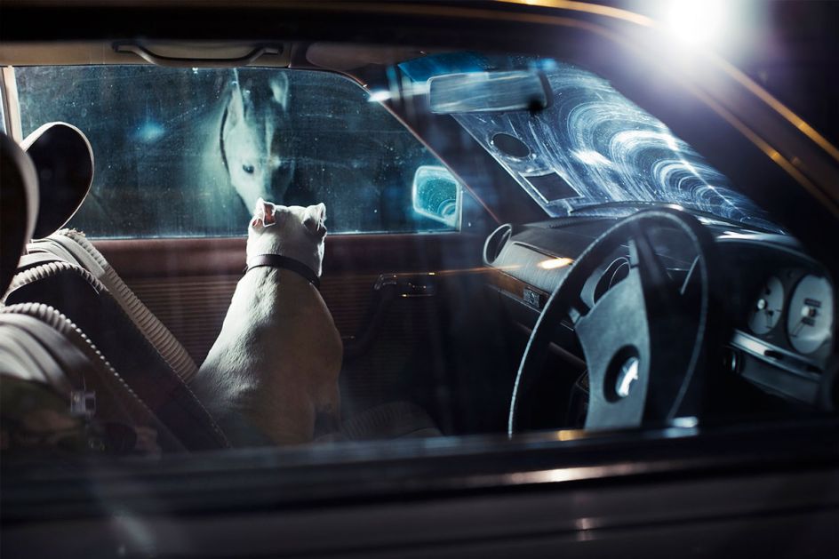 Although his imagery is sometimes dark - capturing the way in which we silence, control or distance ourselves from animals - his work strives for a hint of humour. This particular series called 'The Silence of Dogs in Cars' relates to his experience when he was once left in a car at a young age, and wondered if anyone would come back - even though he was loved as a child and someone did.