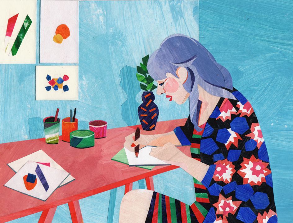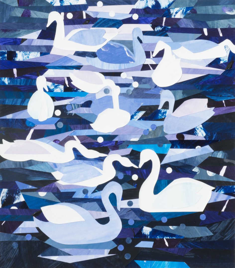 Using traditional cut and paste collage techniques, Alice slowly assembles a detailed, colourful image, building up the artwork by layering paper and gluing it in place. The final work resembles a painting, but in actual fact is composed of many, many pieces of painted paper.