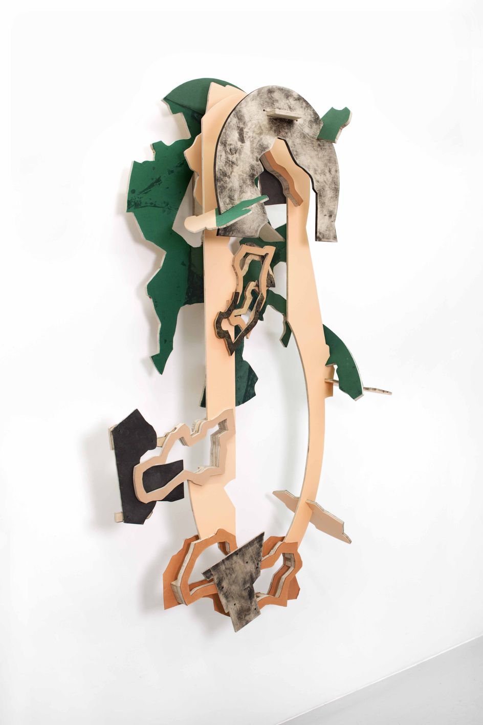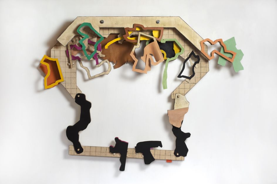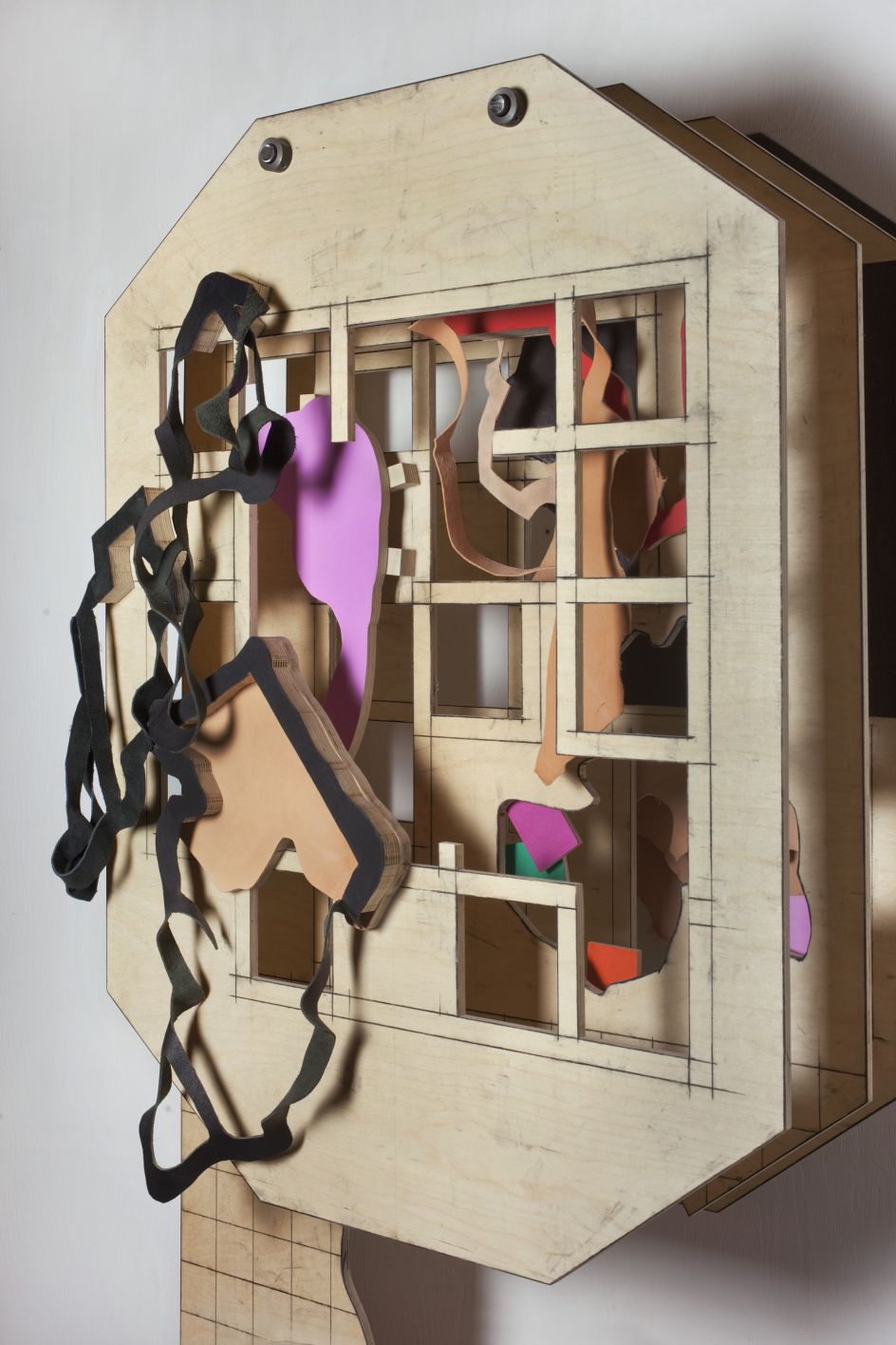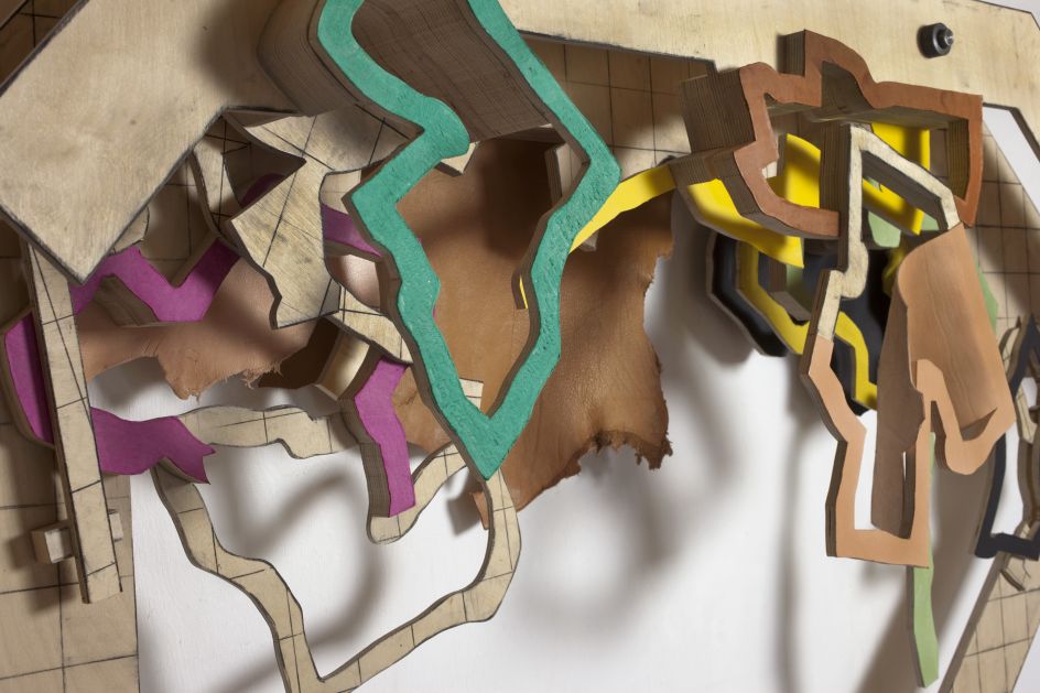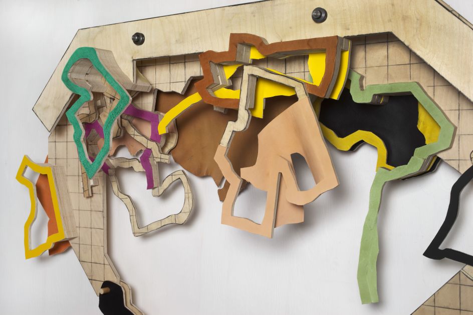 In Bang’s new wall-works the character of the panels, as well as the stencil components, relating to the multitude of configurations found in the funerary portraits. Individual stencil elements are cut out of the plywood panels, then a process of transformation and expansion is initiated by fragmenting the stencil components and constructing varying clusters of activity. Cloth and leather patches are subsequently attached to portions of the stencil elements, partially cut free, and hanging in a peeling gesture from these components.