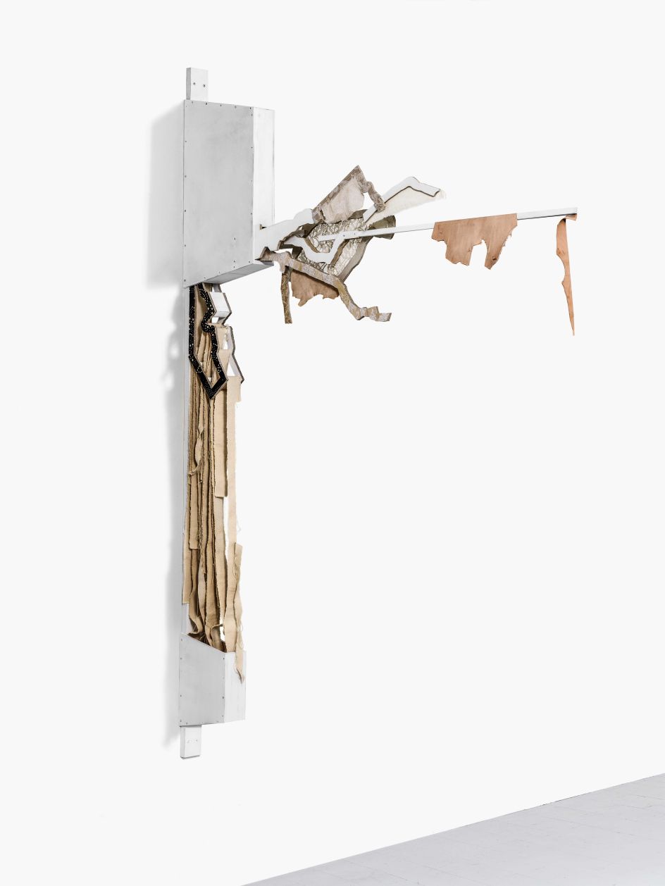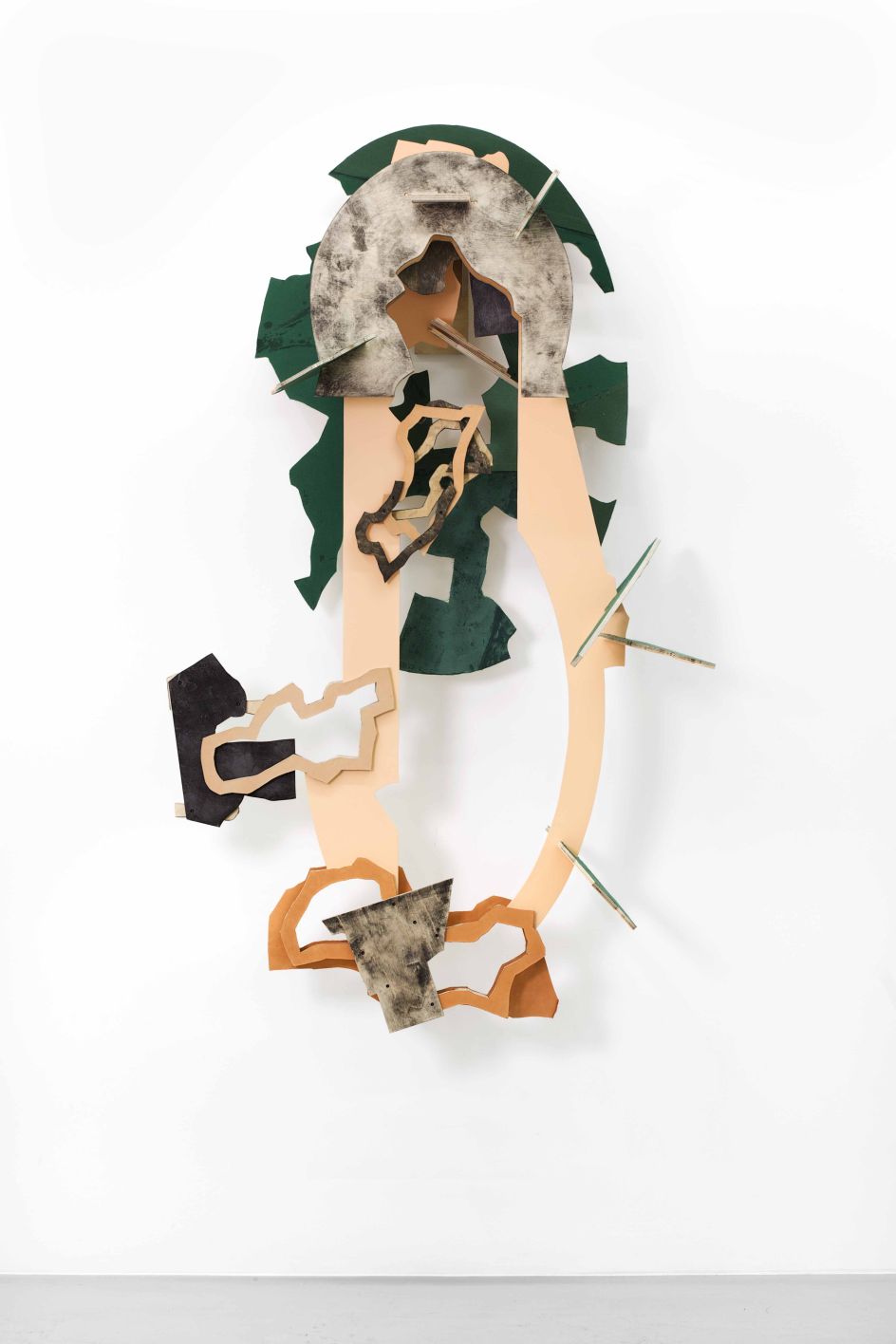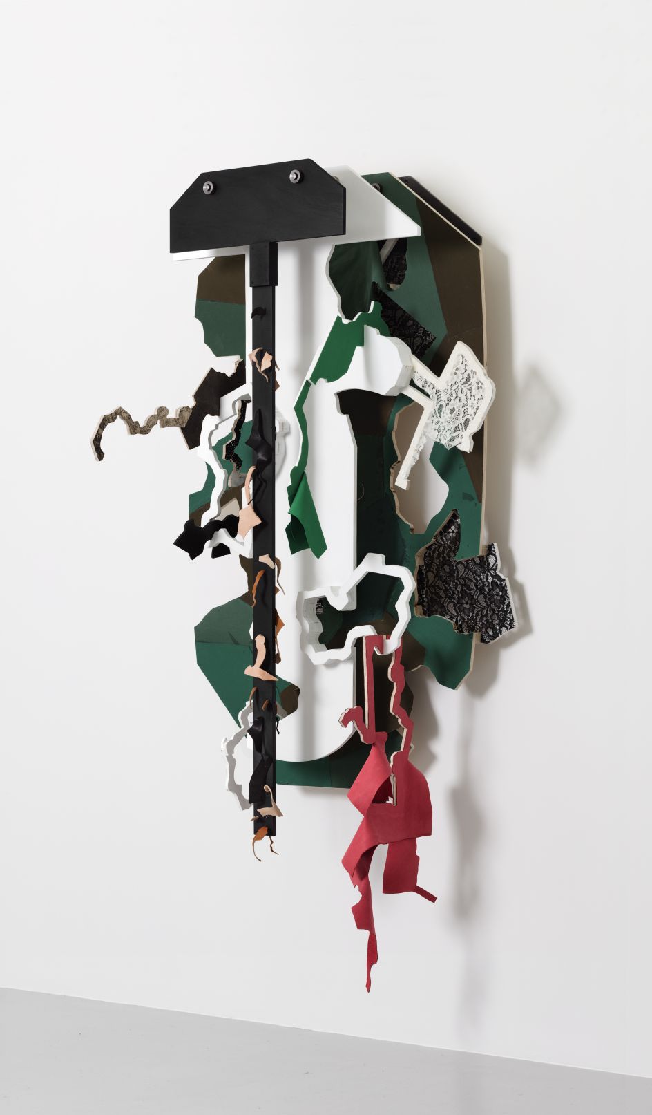 In Bang’s new wall-works the character of the panels, as well as the stencil components, relating to the multitude of configurations found in the funerary portraits. Individual stencil elements are cut out of the plywood panels, then a process of transformation and expansion is initiated by fragmenting the stencil components and constructing varying clusters of activity. Cloth and leather patches are subsequently attached to portions of the stencil elements, partially cut free, and hanging in a peeling gesture from these components.