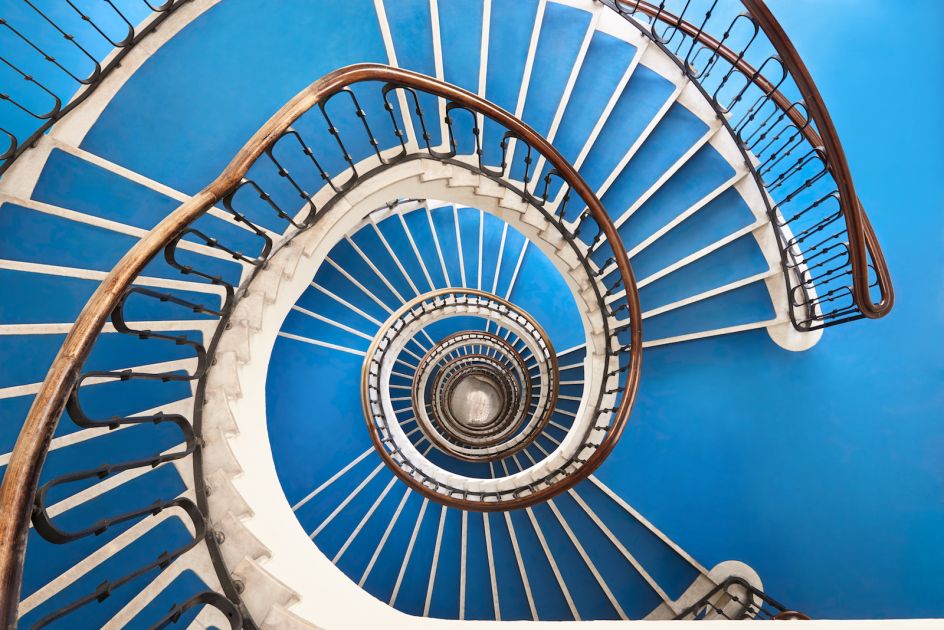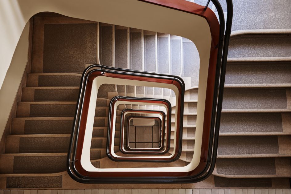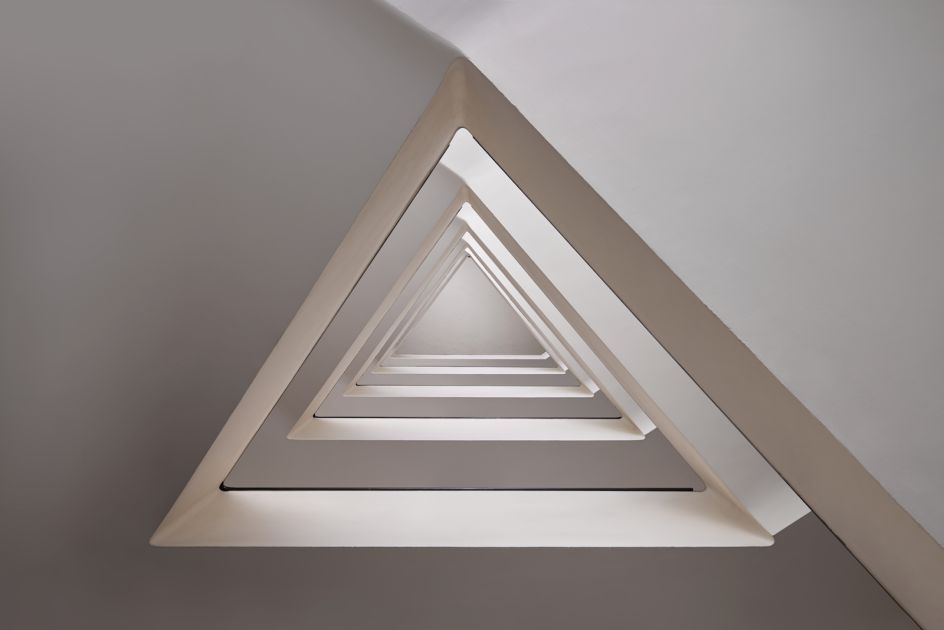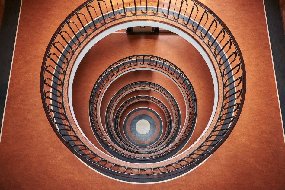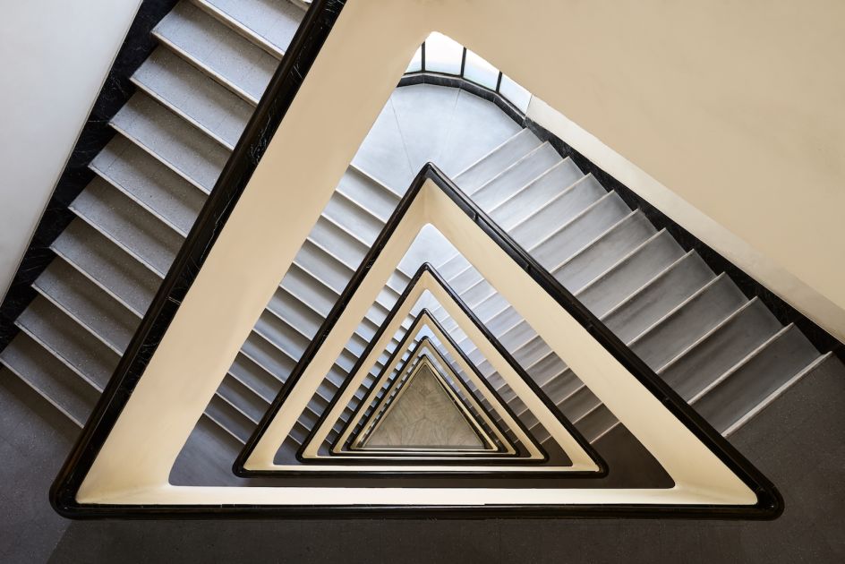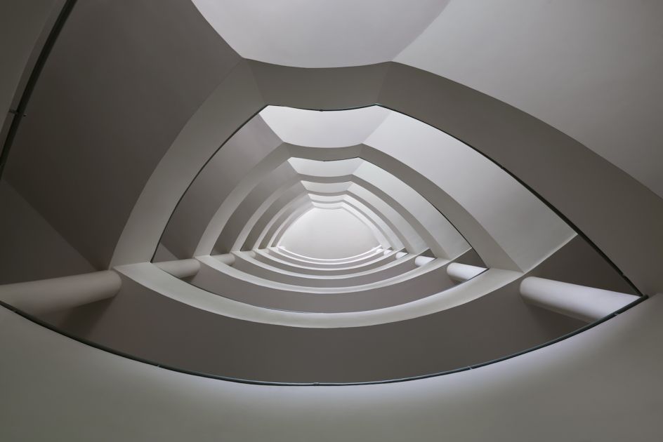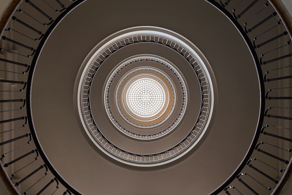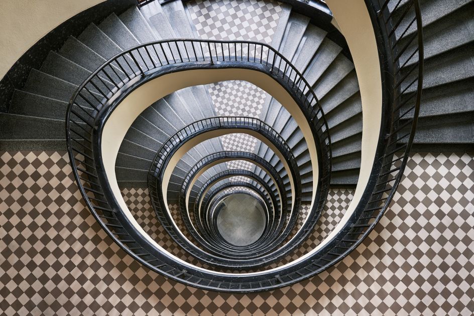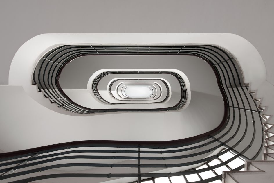Apparently, it's a deliberate study of Bauhaus and Art Deco caracoles in Budapest, Hungary. "The photographs show spiral staircases from the same central perspective," explains Balint. "With the pulling energy of these spiral forms, the works of Time Machine create a new dimension by splitting space and time, while staying within the visual limits of the project’s concept, while the perception of the architectural details evokes the idea of infinity."