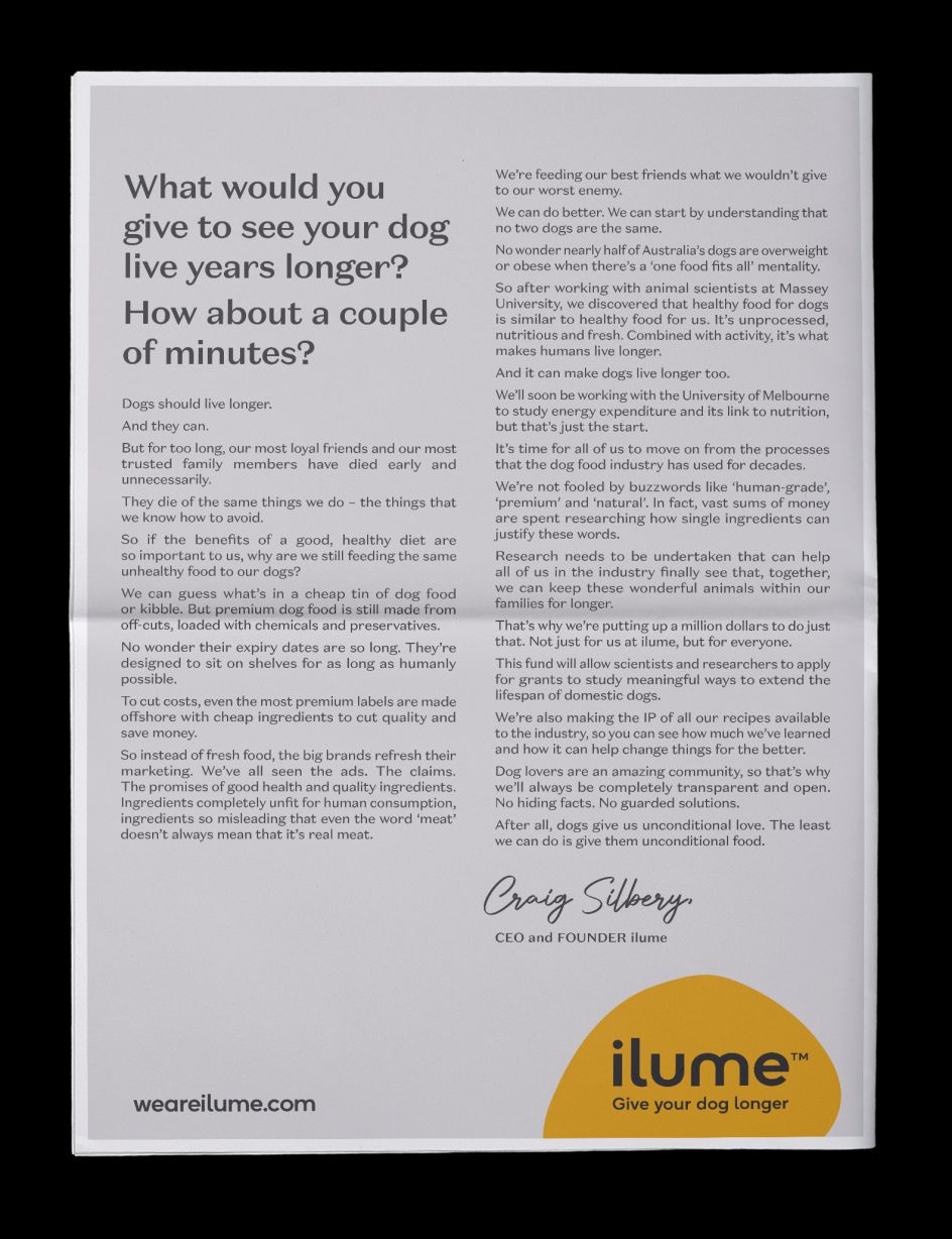 Topping off the publicity is an open letter to the dog food industry, which announces a million-dollar fun from Ilume. This fund will go towards studying nutrition for domestic dogs and invites scientists and researchers to submit research ideas for grants.
