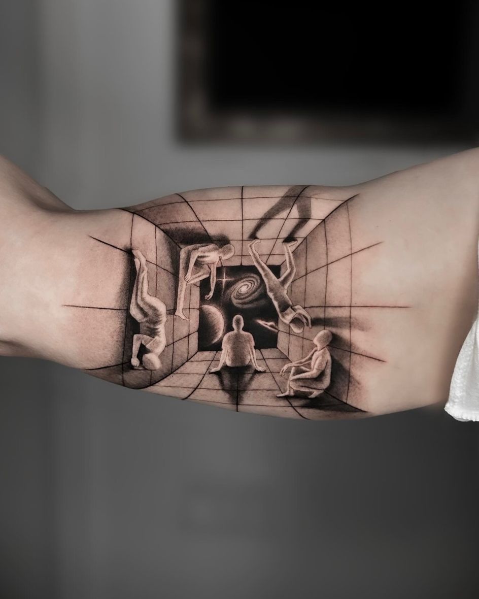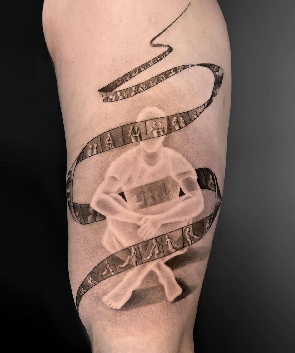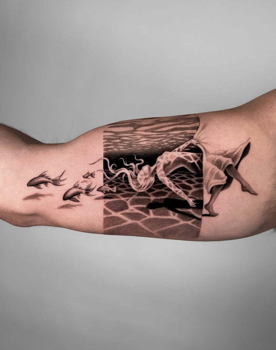 What makes this even more interesting is Travis's background. He came to tattooing from engineering, which perhaps explains the structural precision in his work; the way light behaves across his pieces feels engineered rather than approximated. His shading draws on chiaroscuro painting and photographic lighting, and the results sit somewhere between graphite illustration and concept art. The technical fluency is obvious, but it never overwhelms the storytelling.