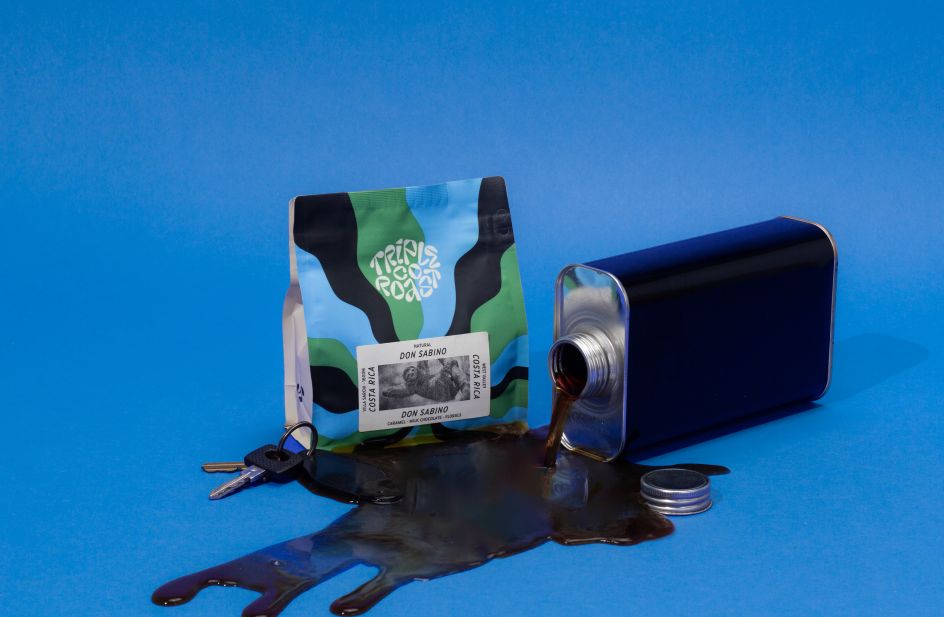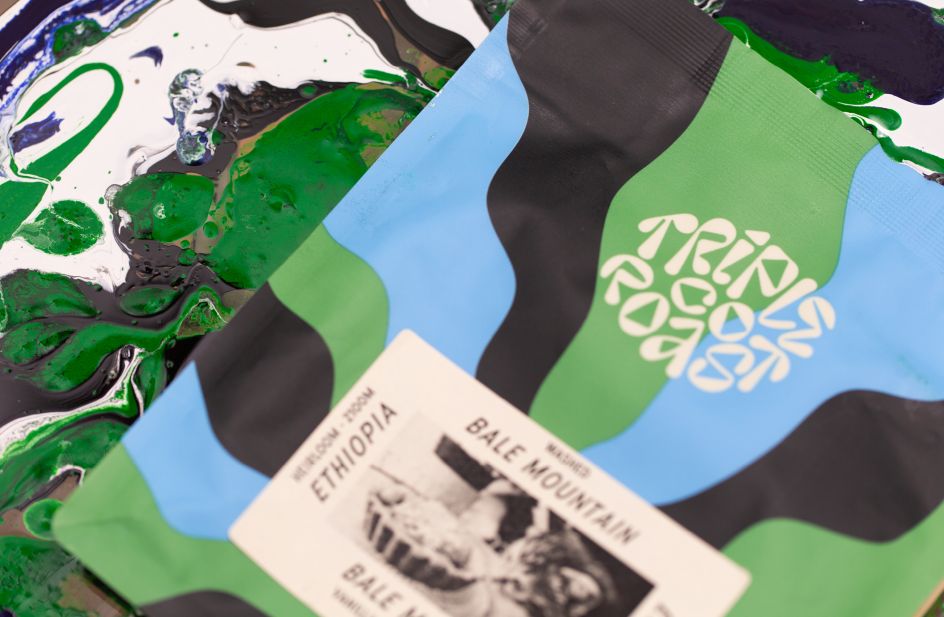 The main pattern on the packaging is influenced by oil spills and fluid motion and brings playfulness and vibrancy to the brand. Packaging labels feature a hint of tongue-in-cheek through photography, interpreting each roast's abstract flavour notes through food, a quirky object, animal or scene. The coffee details on the labels unconventionally use type to frame the photo, lightheartedly leading the reader's eye around the image.