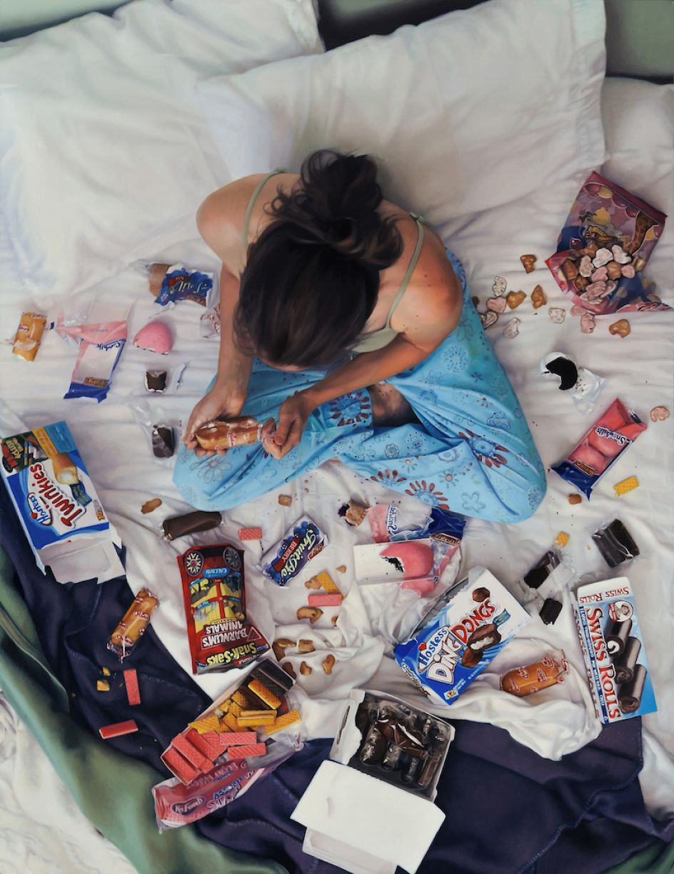 These pictures are actually self-portraits, showing Lee getting excessive with food that is considered especially indulgent and forbidden. I guess you could say that her work points to the pressures that women face on a daily basis.