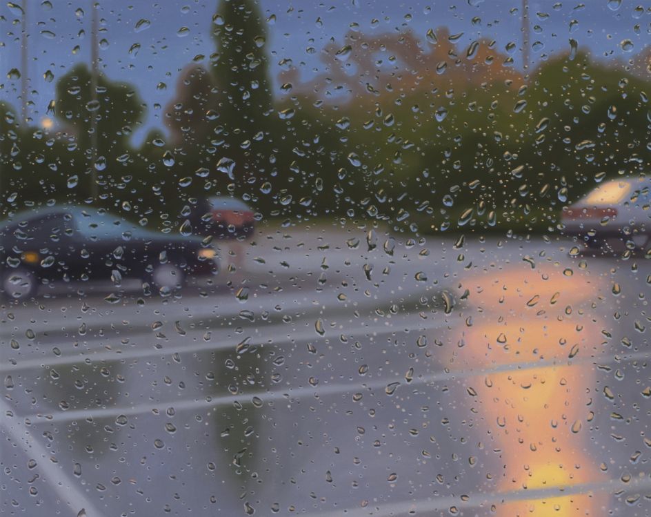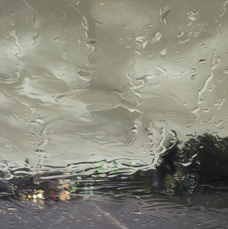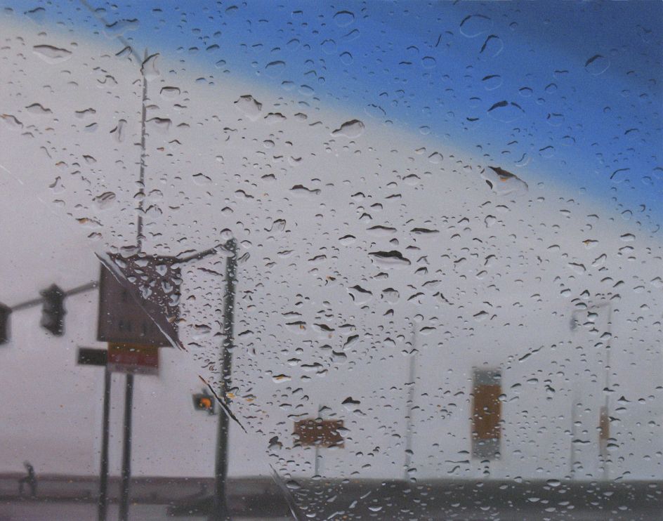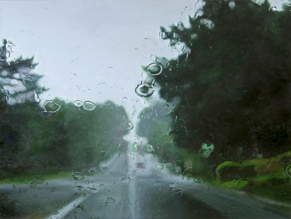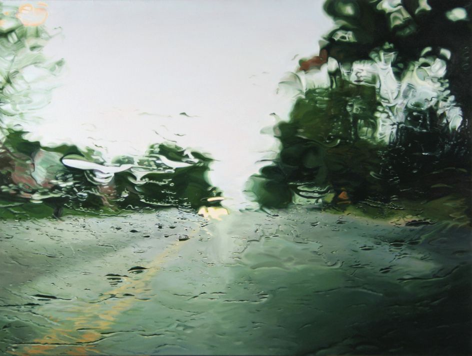 He explained: "These paintings reflect my interest in the way that the road delineates and controls how we experience landscape. From the roadway perspective, we not only travel from one place to another, we see landscape in a varied and complex manner. I use water on the windshield to create a shifting lens for the way we see the environment: it both highlights and obscures our viewing.
