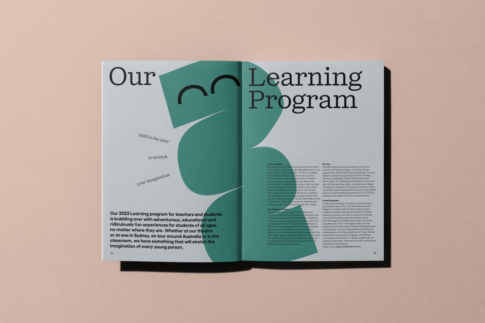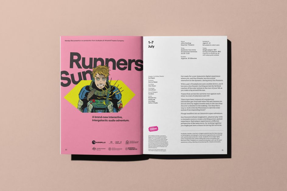 "We drew on everything from playful layouts to bold shapes, papercut to screenprint and a huge range of hand-drawn textures. Then we took to the tools to create a visual system that reflects the unlimited imagination evoked by a Monkey Baa experience and brings literature to life as their shows do."