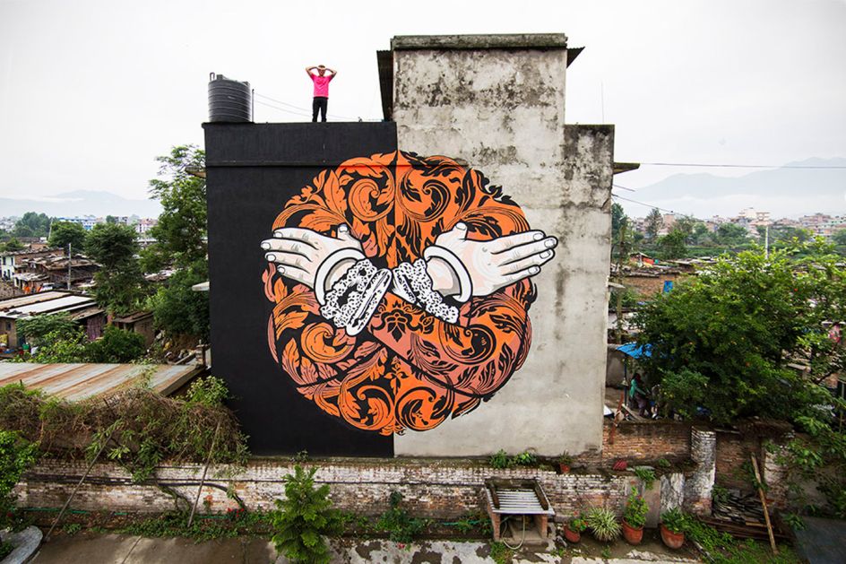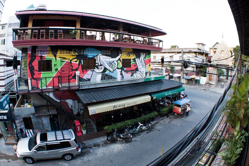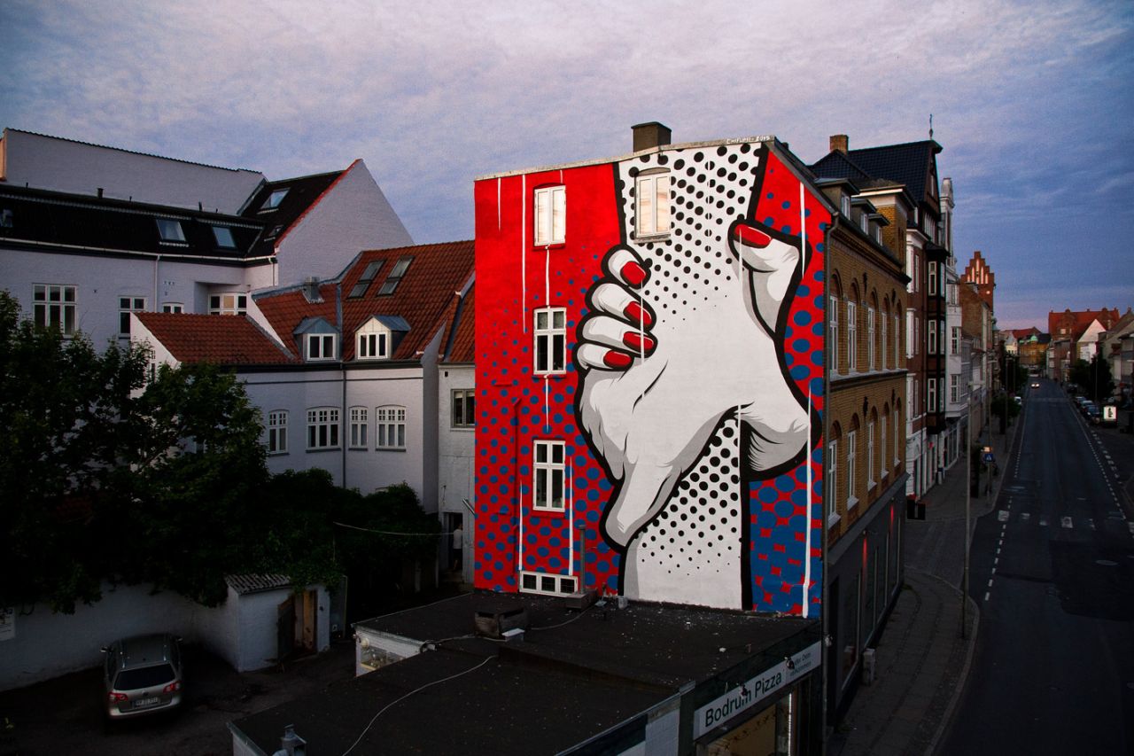 This colourful collection of street art murals is the handiwork of Chifumi Krohom. Based in Cambodia, the artist has painted these giant scenes, which all feature his signature 'hands', on buildings in his home city, as well as in Denmark and France.