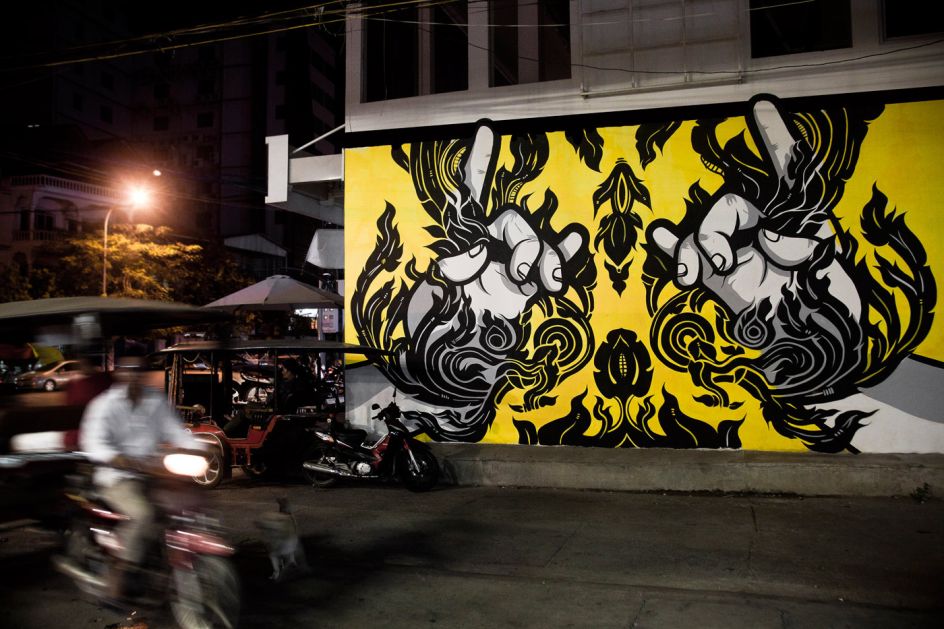 Sometimes Krohom's hands appear on abandoned houses located close to the jungle, and sometimes they appear on chic restaurants in the busy Cambodian capital, Phnom Penh. Others were created during the artist's travels to Nepal.