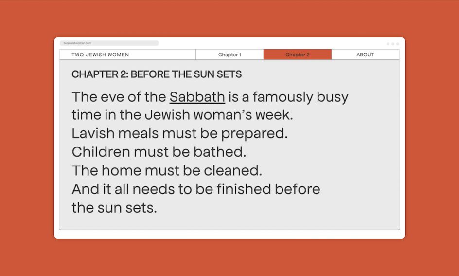 That aesthetic looks to disarm viewers, in a way; make it familiar but also different enough to intrigue and encourage the site's visitors to explore further. This approach serves as the perfect vehicle to demonstrate that the experiences of Jewish Orthodox women aren't easily defined—they're multitudinous and complicated as any other women's lives.