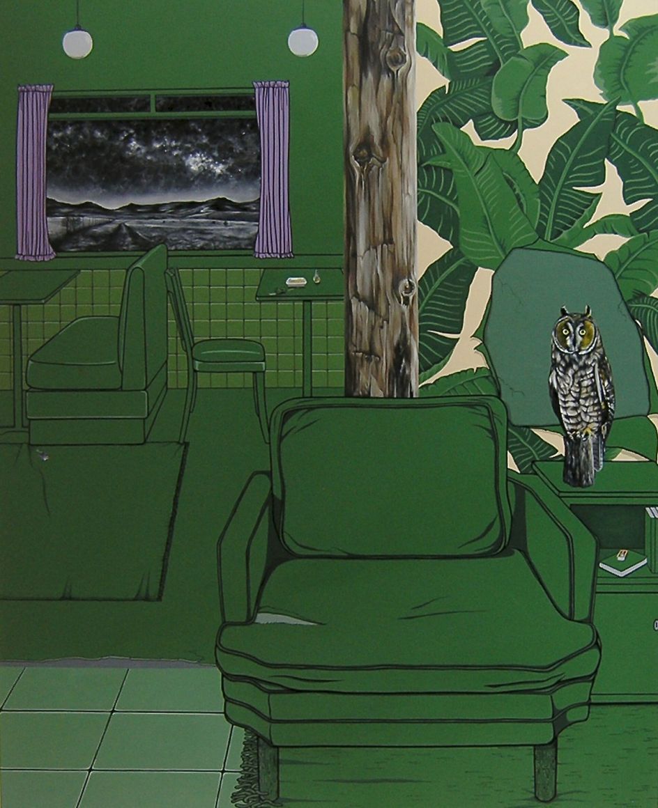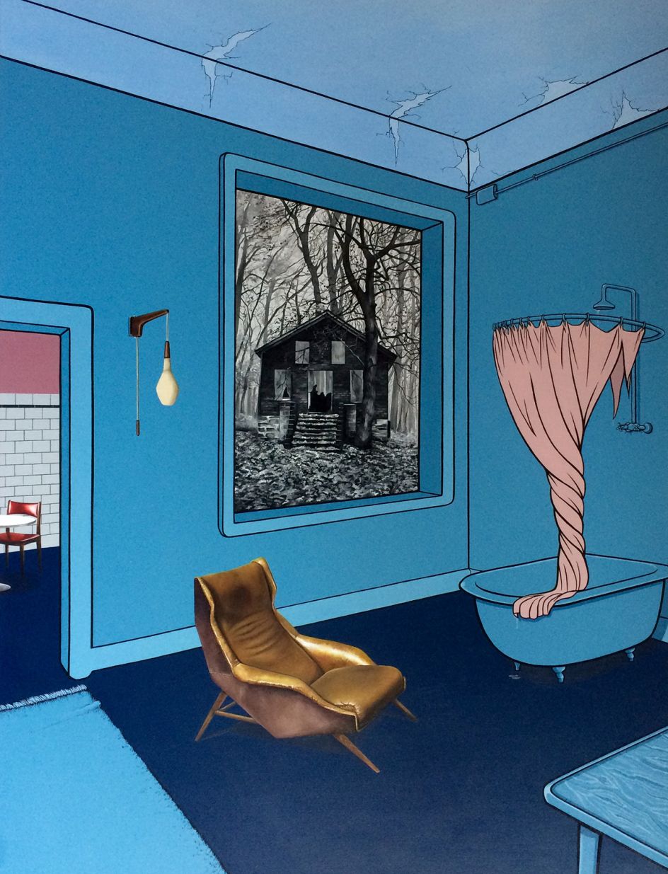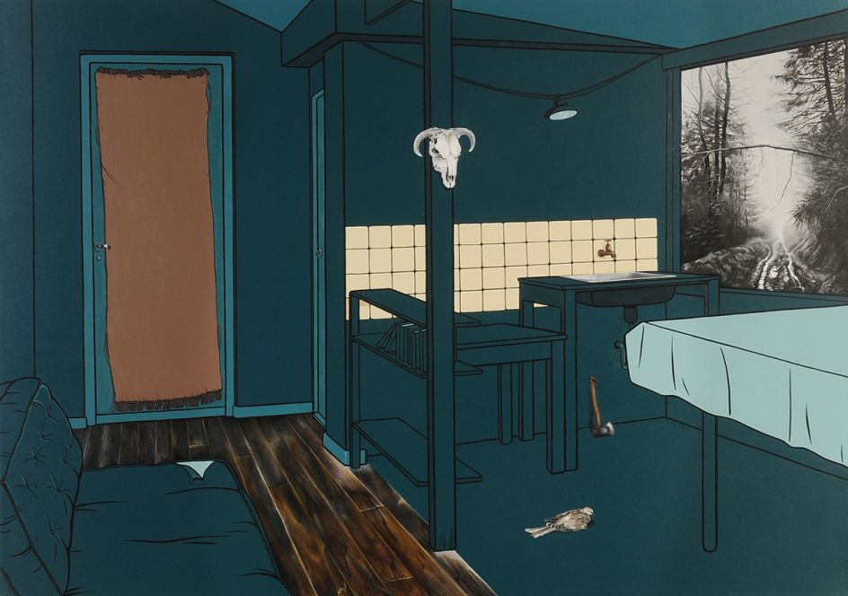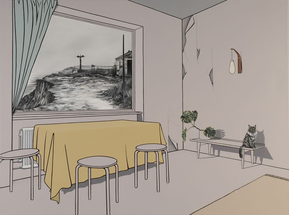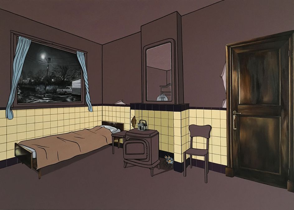Vanessa Smith's mysterious paintings of interiors, whether it be a deserted cafe or dimly-lit living room, are imbued with an eerie tension. Devoid of people, there are suggestions of life – a smoking cigarette, perhaps, or glowing light – all hint at a fractured narrative.