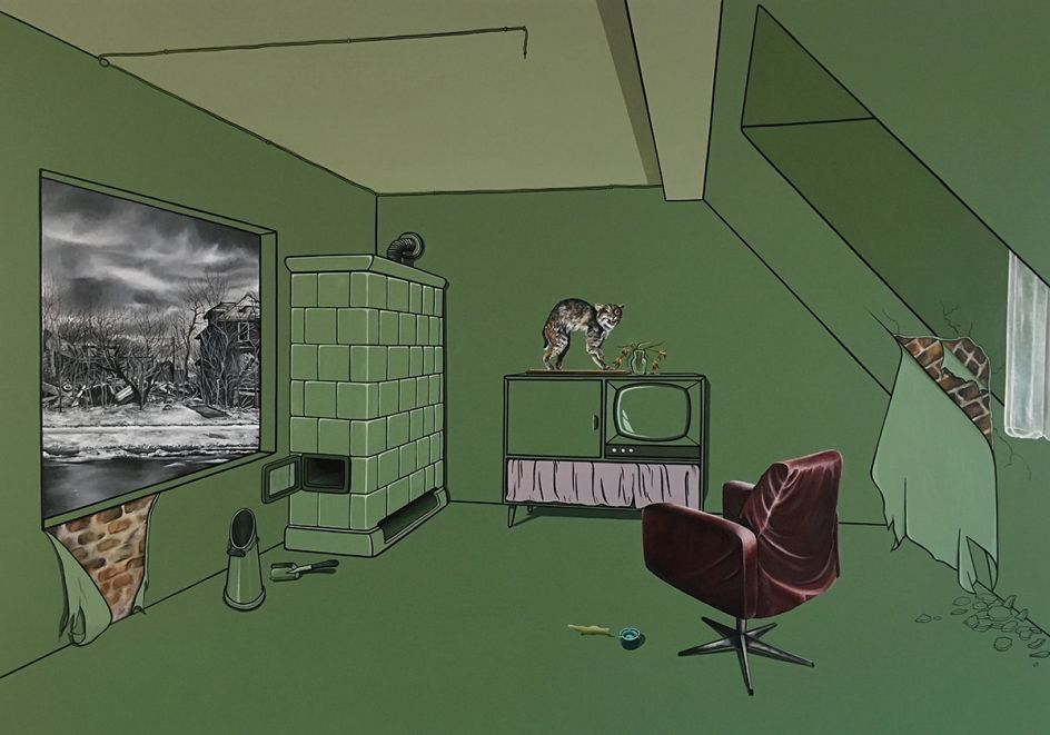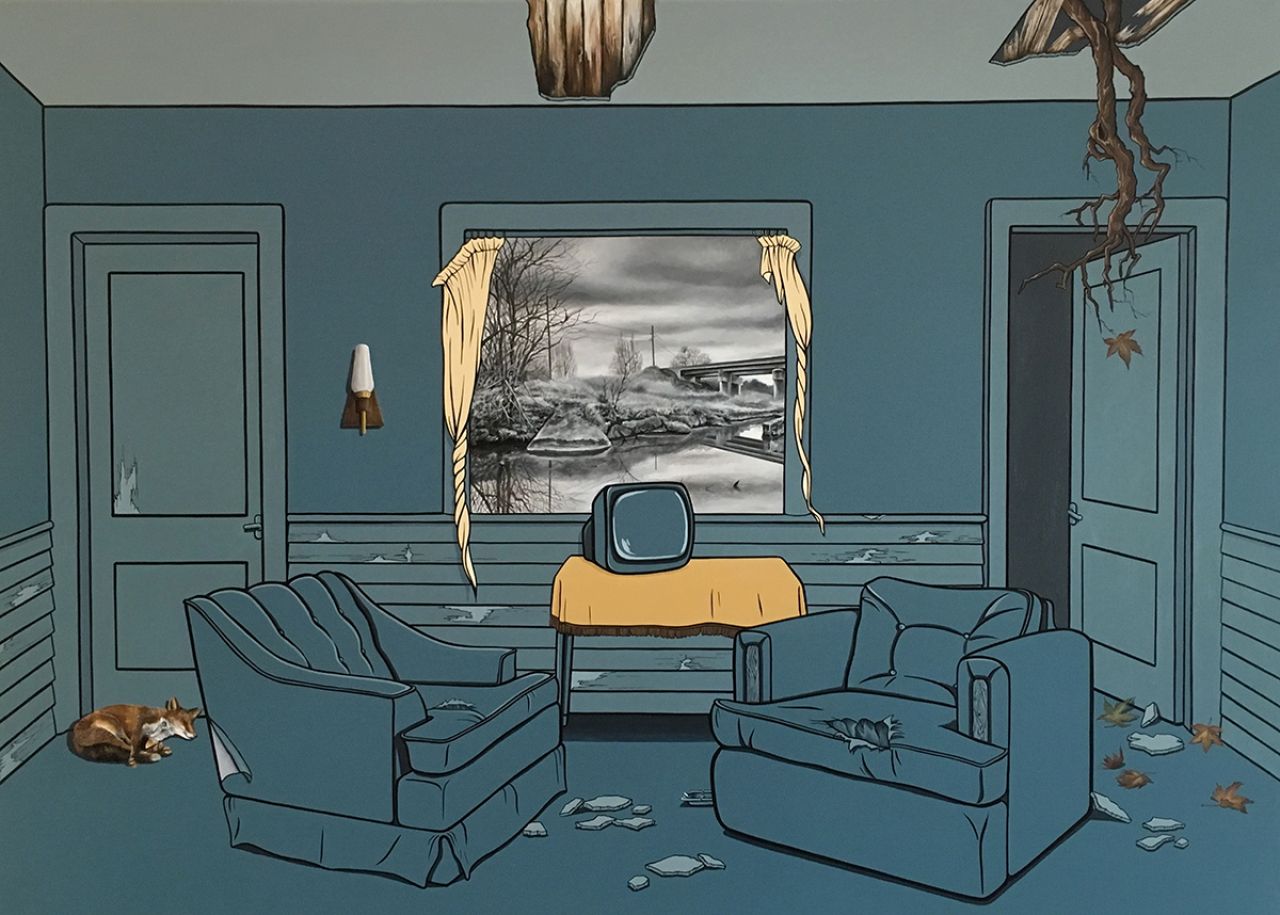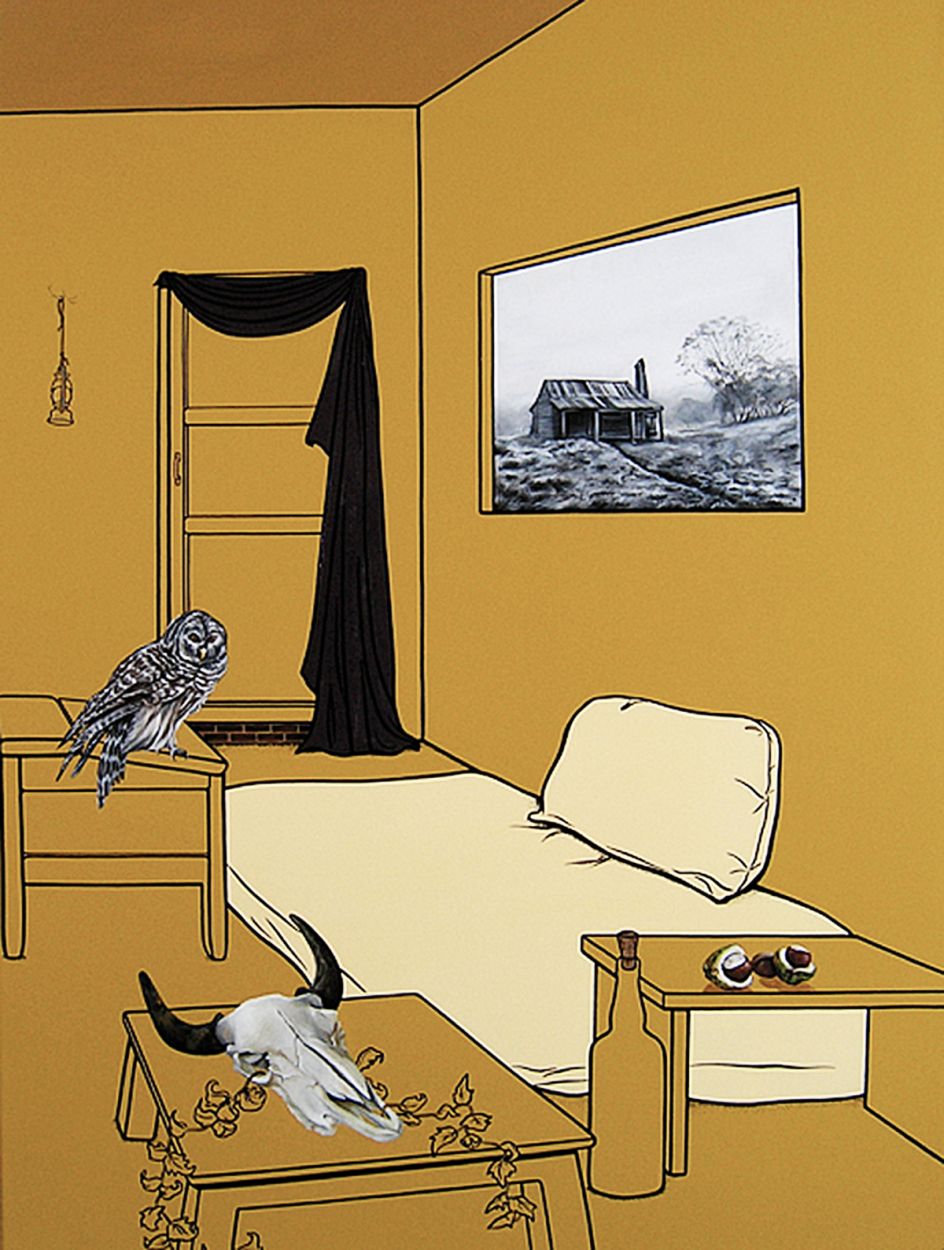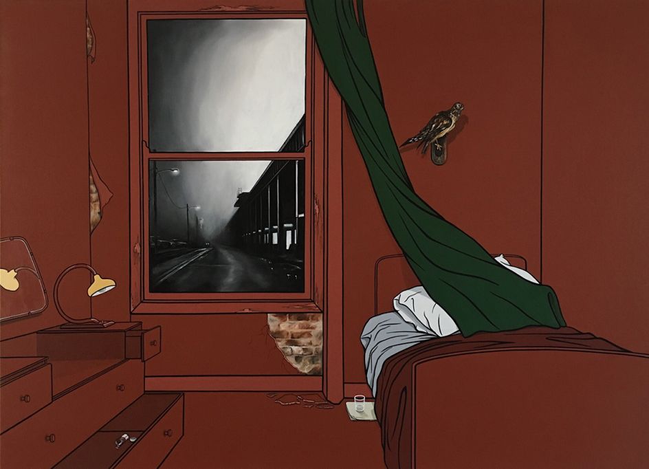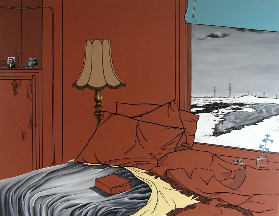 Vanessa Smith's mysterious paintings of interiors, whether it be a deserted cafe or dimly-lit living room, are imbued with an eerie tension. Devoid of people, there are suggestions of life – a smoking cigarette, perhaps, or glowing light – all hint at a fractured narrative.