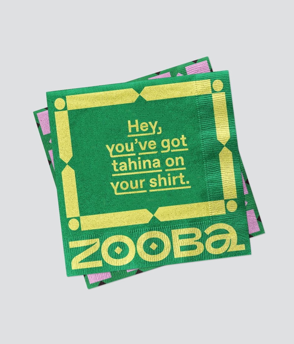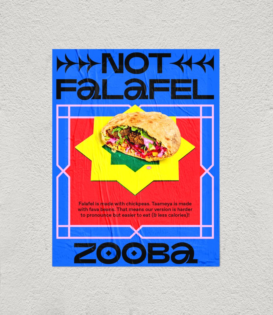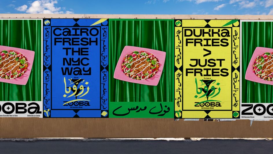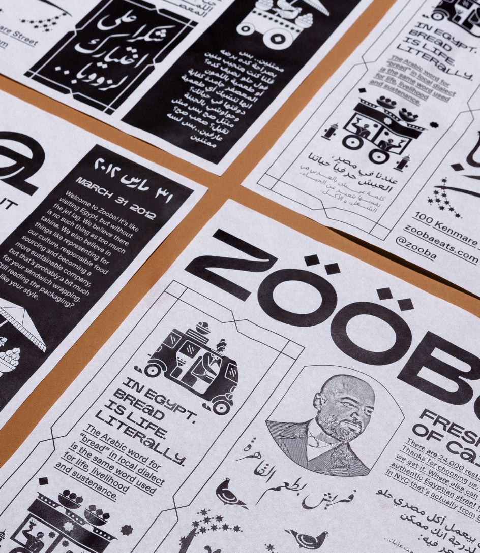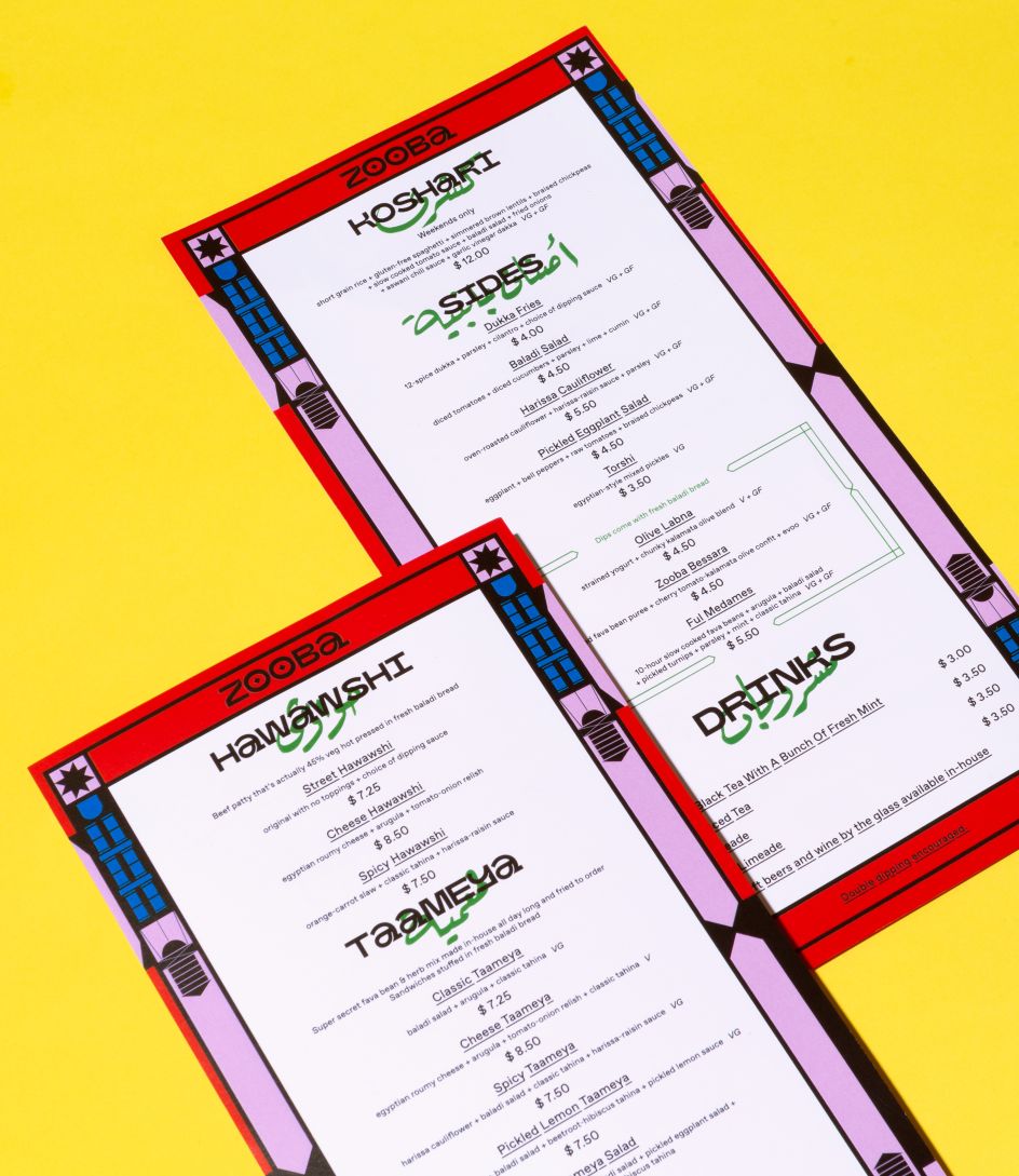 With the opening of its first store in New York, it approached &Walsh to create its new brand in America. Walsh told us that they went to Cairo to meet Zooba's team: "We were inspired by the "beauty of the layered visuals we saw on the streets: the hand-painted typography on foul carts, geometric patterned tapes, mix and matched coloured tiles, posters, and painted illustrations on walls."