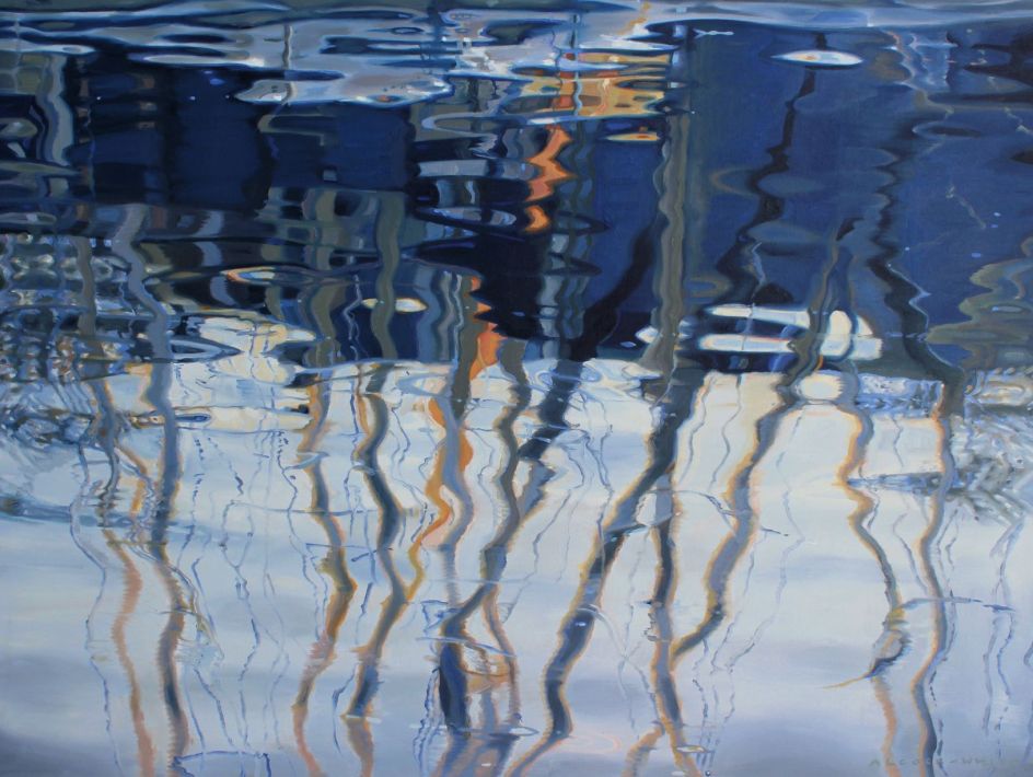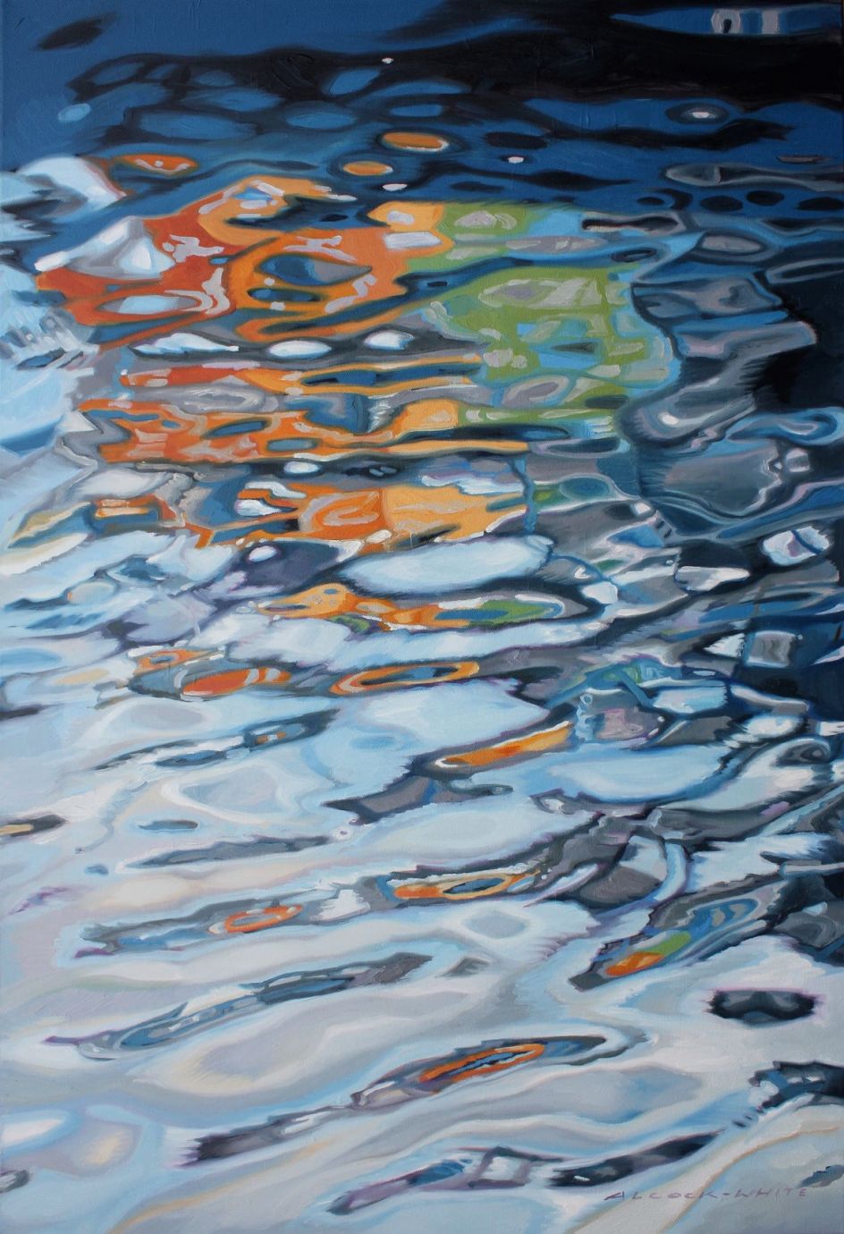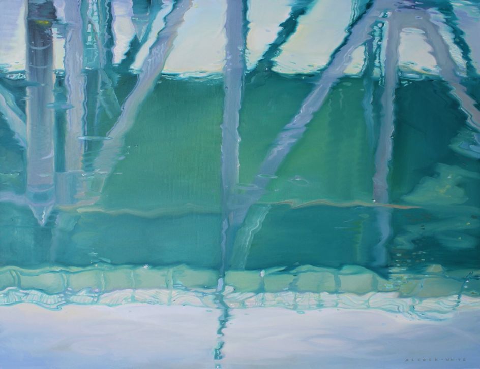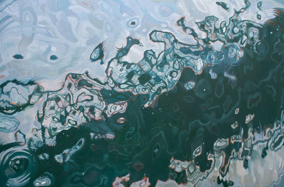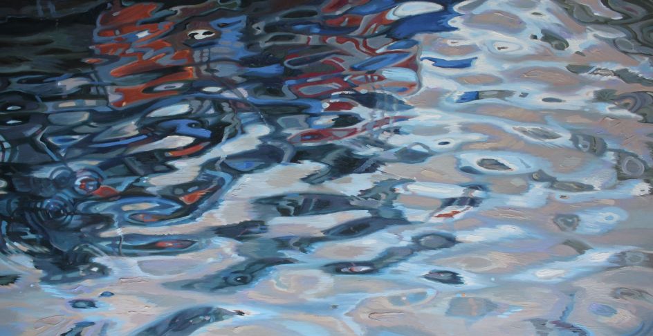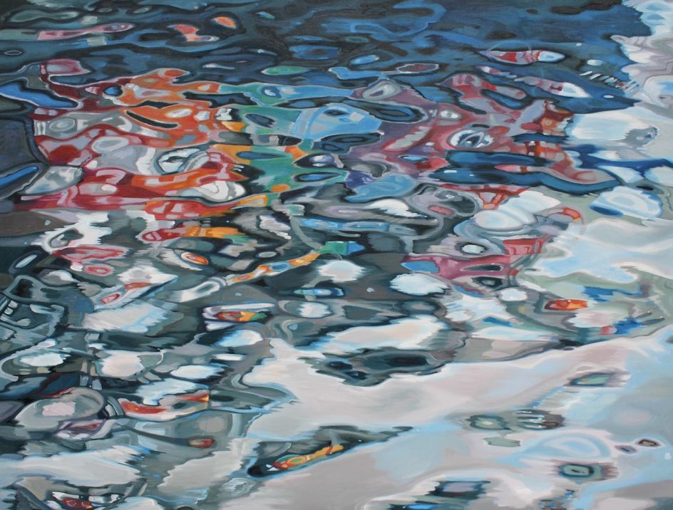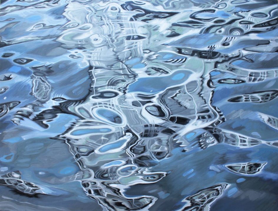By highlighting the reflections and irregular ellipses of flattened colour, abstract patterns and highlighted surface reflections on a body of water, Amelia attempts to evoke a reverence for the mystery and importance of water, our natural world, its fragility and precariousness.