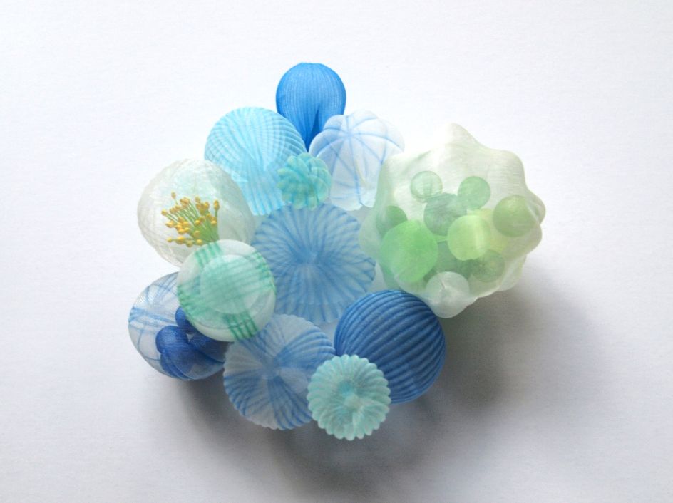 In her latest body of work, jewellery artist Mariko Kusumoto expands on her theme of ocean-inspired pieces with smaller-scale necklaces, bracelets and rings, made from delicate fabric in an array of colours.