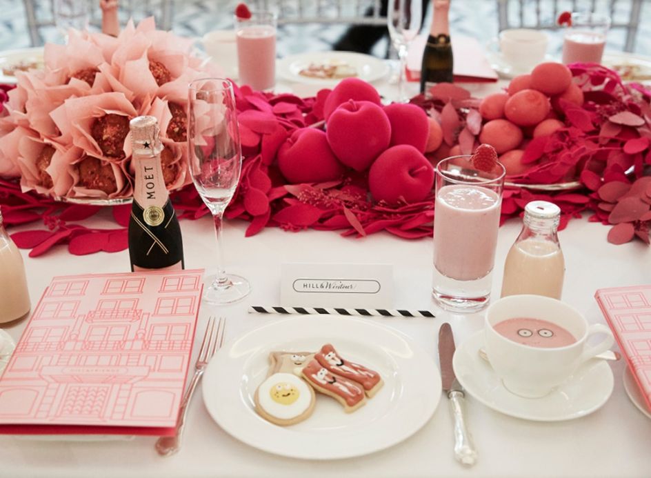 Once seated at the Hill and Friends all pink breakfast table, guests enjoyed friendly breakfast cookies in the shape of fried eggs, rashers of bacon and buttered toast complete with happy Hill and Friends faces… Hill and Friends Bellboys carried the new collection around the room on silver trays, luggage trolleys and even accompanied by miniature ponies in the signature livery.”