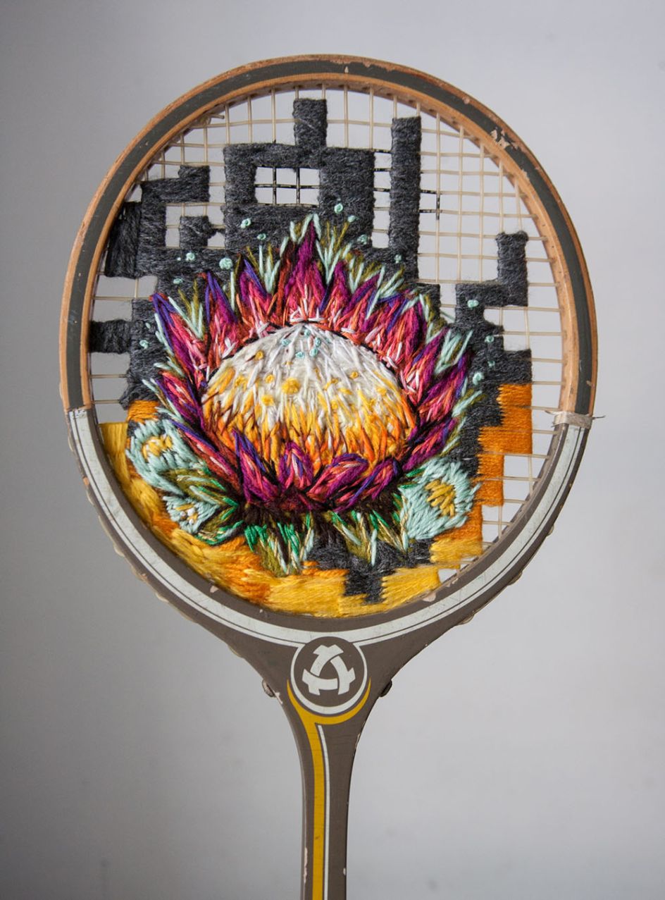 In her series What a Racket, South African embroidery artist and designer Danielle Clough crafts the most incredible threaded artworks onto old badminton and tennis rackets using bright coloured wool. Creating images of big and bold flowers, it's an unusually pleasing take on the increasingly popular fibre art movement.
