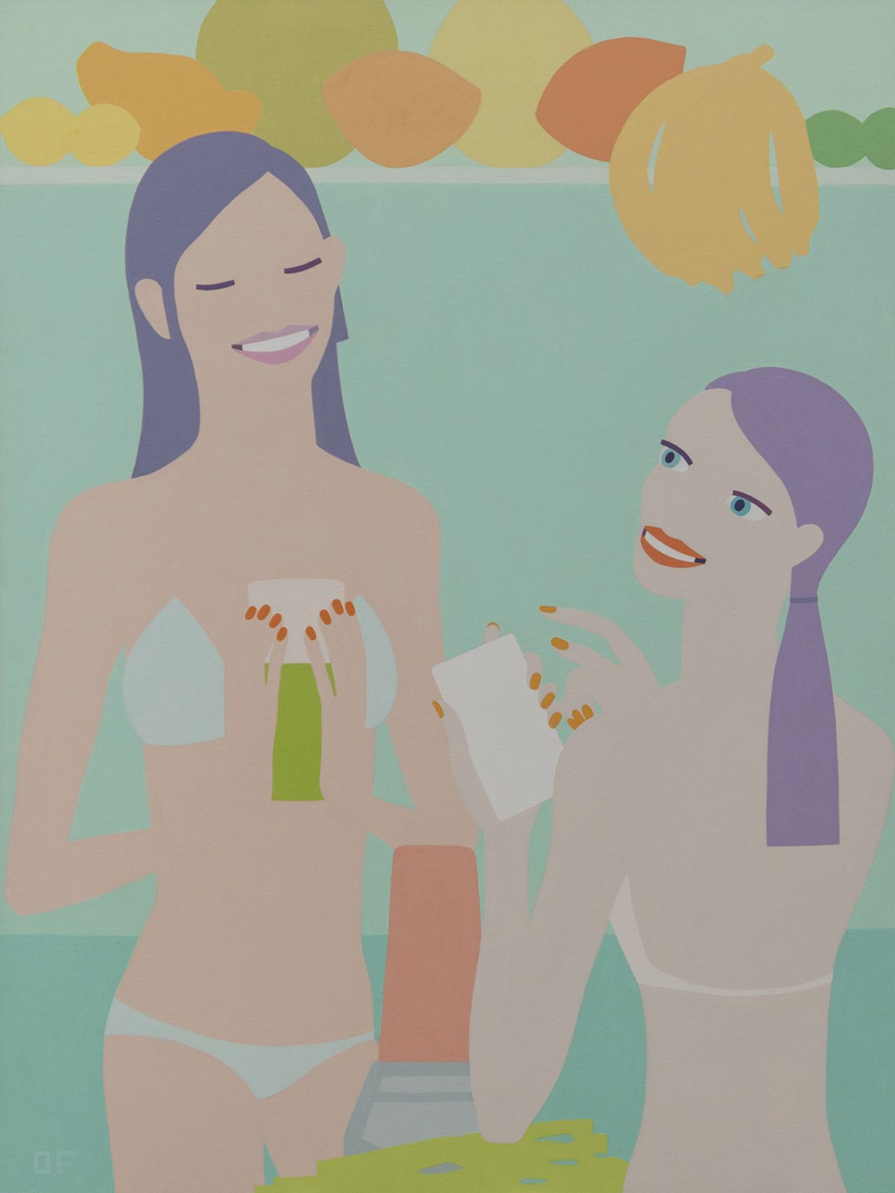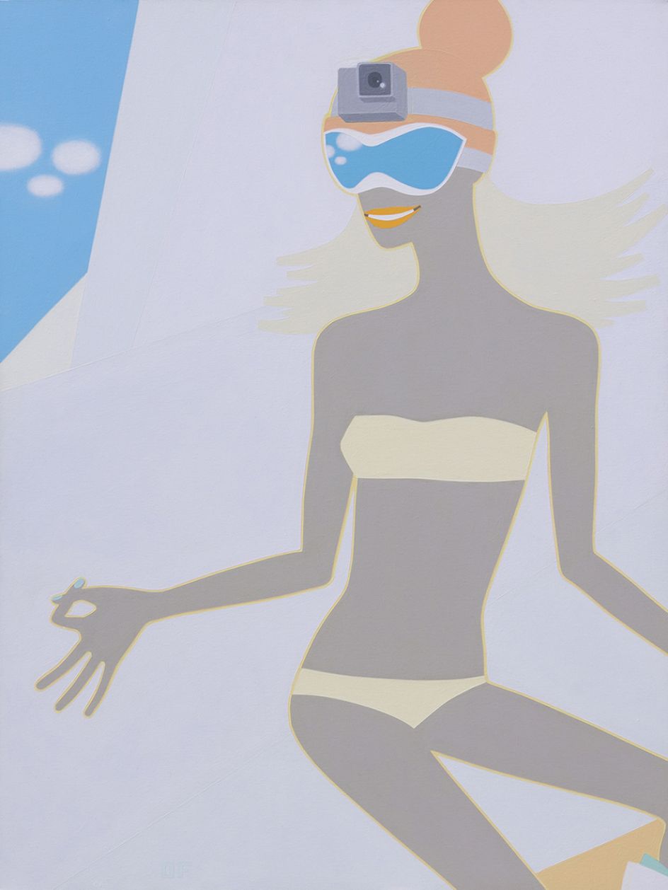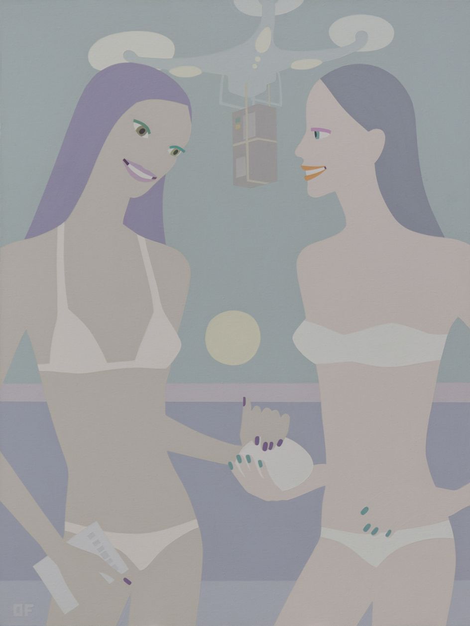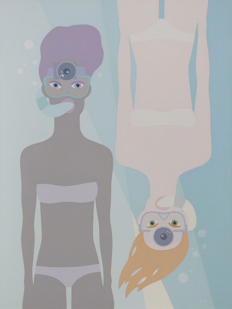 Where Feshina portrays women in groups, she says they “tend to be constantly together as they strive to exchange information and then to share their senses of perception with the whole world. To get better harmony and mutual understanding the new girls subconsciously synchronise their poses, acting in unison either watching a movie, listening to music, taking a selfie, looking for smoothie recipes, getting parcels by drone, exploring the underwater world, virtual reality and their feminine nature with new tech gadgets.”