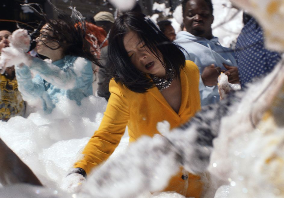 Suddenly Jarvis Cocker's tranquil voice replaces the familiar sound of NYC's busy roads. Everyone goes quiet and calm as bits of foam start falling from the sky. Dogs are jumping up and down, trying to get in on the action, and people are sitting in cafés mesmerised by the little falling white clouds. As Cocker's voice gains momentum and the towering organ drone, chanted lyrics, and rumbling percussion gets louder and louder, everyone jumps into the pit of foam to dance, hug and sing.