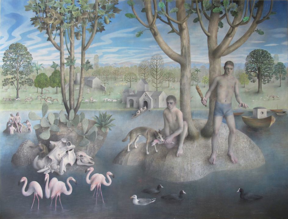 A provocative new exhibition, Land of Mortimer, features mystical landscapes populated by naked figures and exotic beasts revelling in macabre scenarios. Among seemingly serene settings of soft blue and green landscapes, we're confronted, upon closer examination, with disturbing scenes of characters drowning and mauling one another.