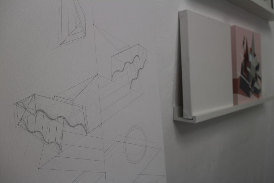 "Through muted palettes and minimal compositions, Wired centres the graphic form of the Wolf. The Wolf floats in no discernible space, often duplicated or fractured among recognisable objects from contemporary culture and nature. His surface appears to be made from hard, durable materials like concrete or marble. Like a fortress, his walls protect something vulnerable, as we explore his form, soft spots are revealed to us in pink fleshy tones.