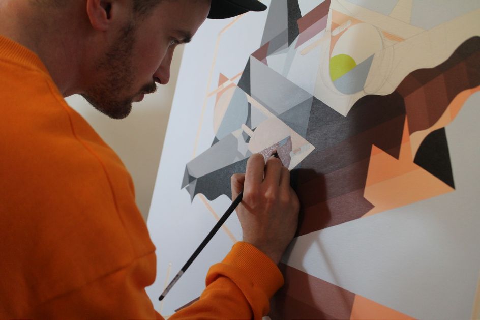 Their work comprises several reoccurring characters all constructed from bold geometric shapes and vivid patterns. As the viewer begins to deconstruct these forms, the complexity of their aesthetic is revealed with each symbol introducing another layer to explore. The contrast in the forms is as evident as the conflict with our human sensibilities…hardwired to progress but an innate urge to return to the past.
