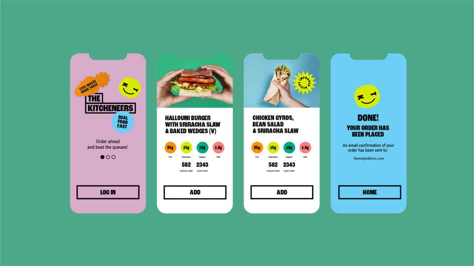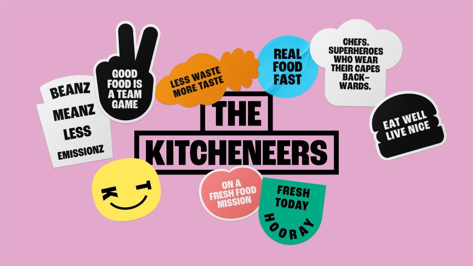 The visual identity was also influenced by research showing that today's students are motivated by high street brands that make life simple and who take their mission seriously, but not themselves. In response, The Kitcheneers took a confident but approachable tone that brings authority and energy into typically generic dining halls.