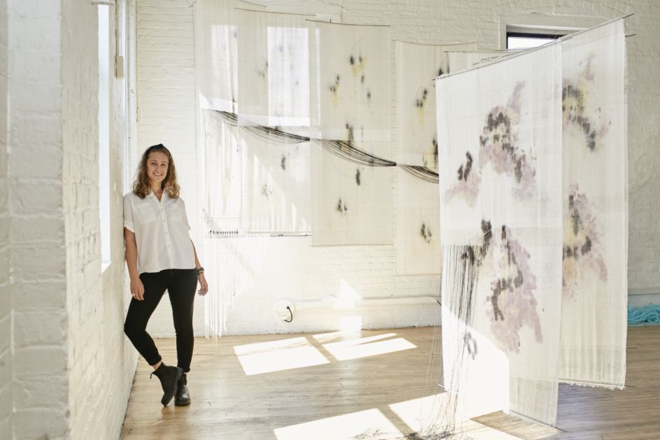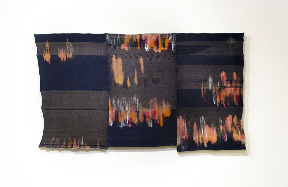 Victoria's artwork often focuses on the mysterious and inspiring results of collaboration between persons and materials. She explores themes of time, space and history with abstract imagery. Created on a loom, every millimetre of the material used to form these paintings has passed through her fingers. Each mark is carefully considered yet motivated by intuition.